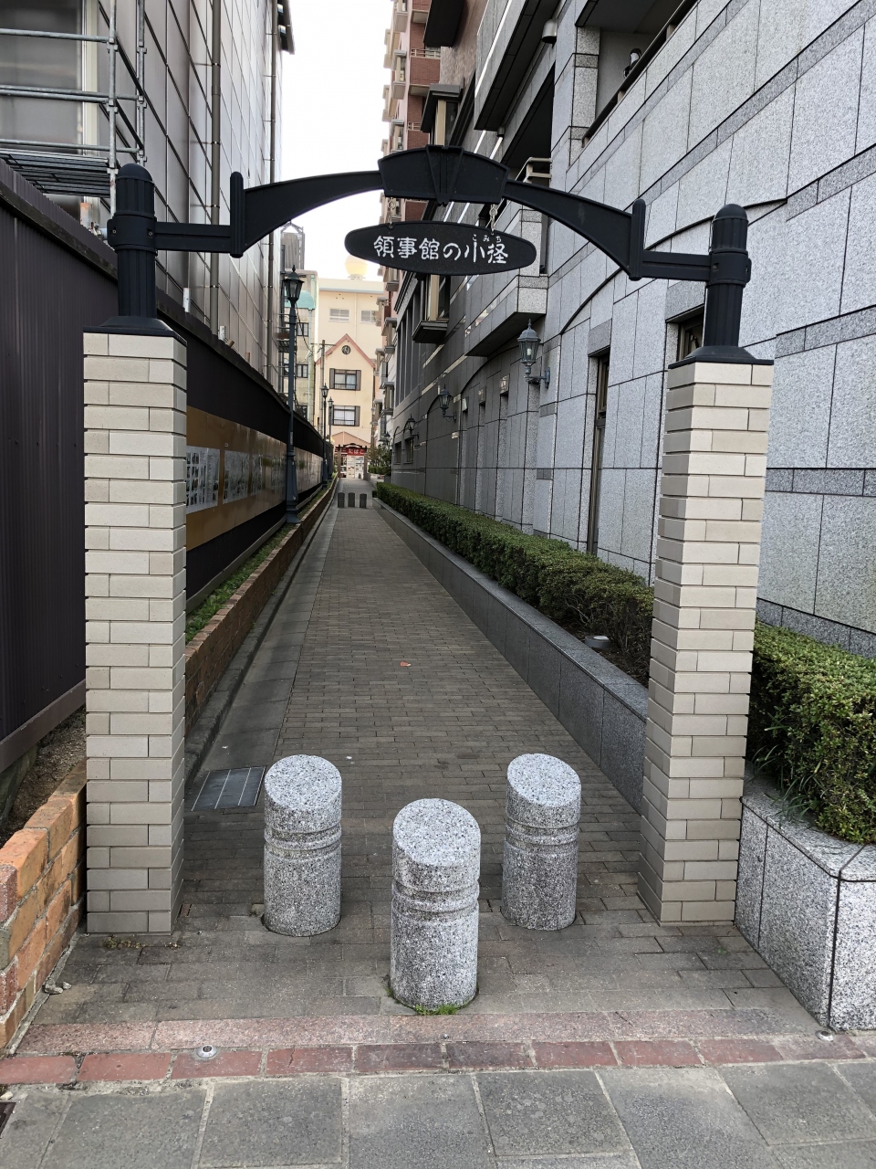 旧イギリス領事館の横にある歩行者用の細い路地です。領事館側の壁には保存修理工事中の旧イギリス領事館に関する写真や図面などが掲示されていて、興味深く拝見しました。建物の工事前の現状の様子、工事の様子、イギリスが当時アジアに建てた同じような建物の類例といった資料まで掲示されていました。興味のある方はぜひ!