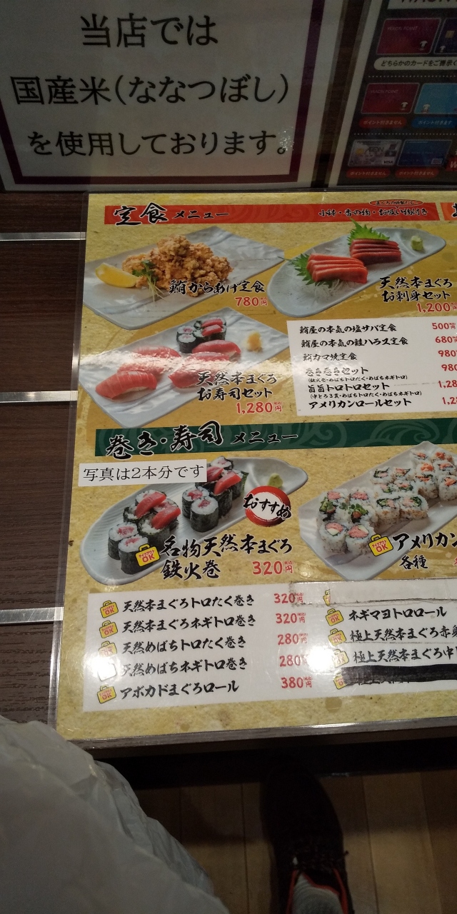 イオン西岡のフードコートに出店したまぐろ専門のお店で、マグロ丼や寿司のイートインとお持ち帰りの両方ができます、マグロ丼もリーズナブルな価格。サク売りもしていて魚やさんが営むマグロ料理屋です。煮物や唐揚げもあります