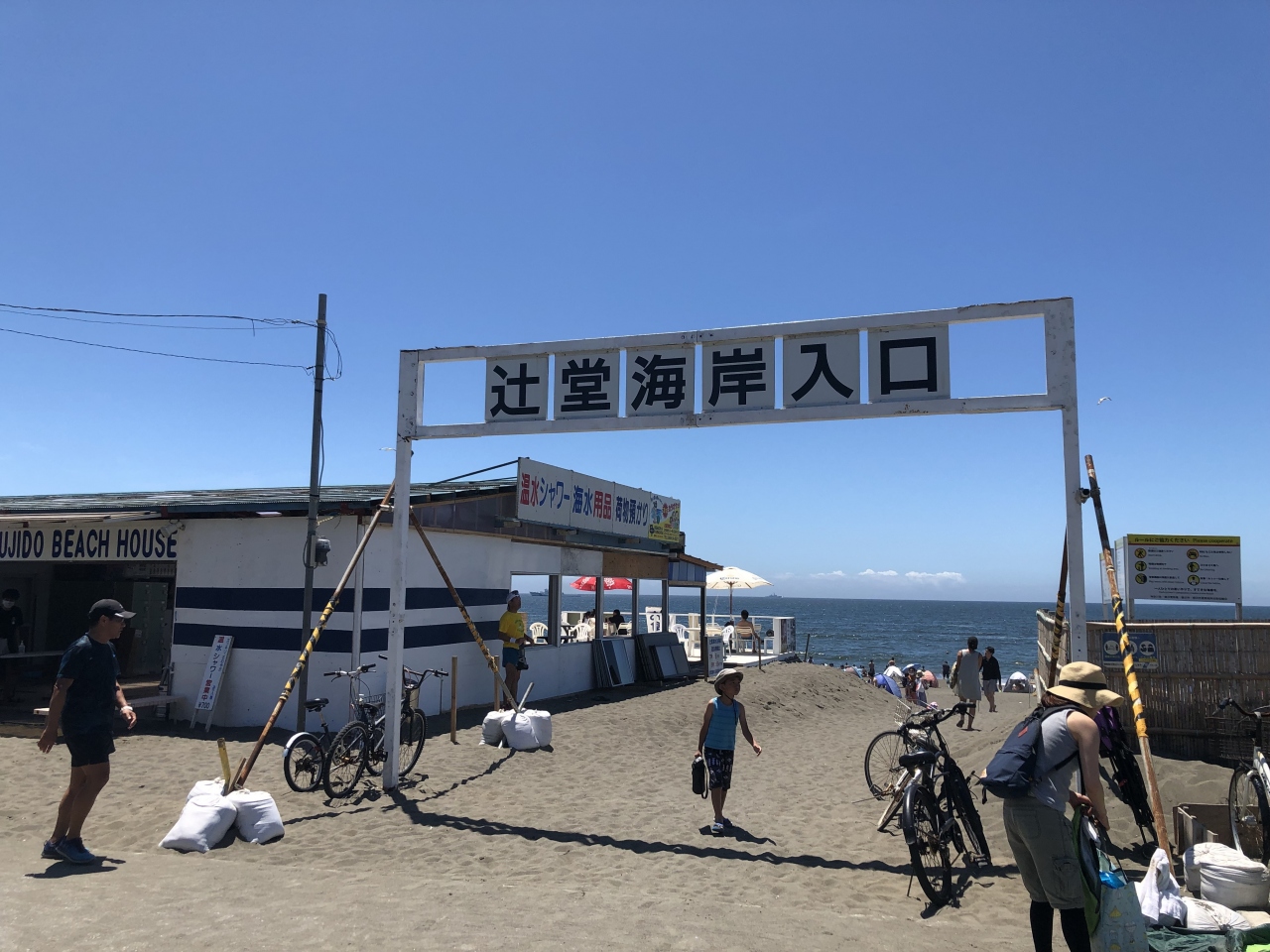 東海道線の辻堂駅から南へ2キロ行くと海岸に出ます。海水浴場の入口には「辻堂海岸入口」と書かれたゲートがあり、海の家はこのゲートの横に1軒だけ。湘南にあって、のどかな海水浴場です。海岸から見える江の島の方へ向かって1キロほど行くと、大勢の人で賑わっている鵠沼海岸(片瀬西浜・鵠沼海水浴場)ですが、静に海水浴をしたい人には、辻堂はお勧めです。