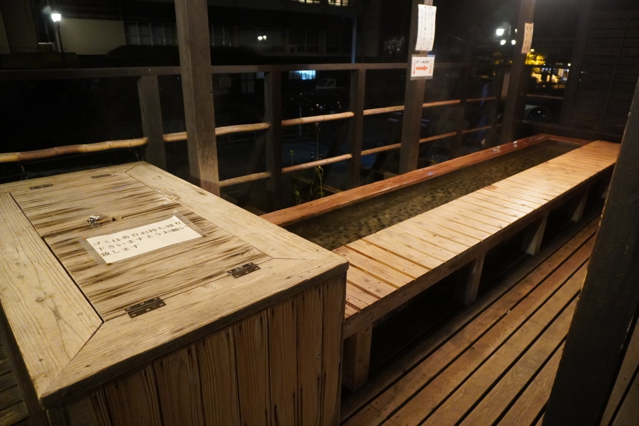 東山温泉足湯処は、足湯と言ってもかなり立派な施設。ちょっと奥座敷と言った方がいいくらいの風情があります。また、川を見下ろすロケーションもいいし。夜8時までやっていて、旅館の宿泊客もそれなりにやってきて楽しんでいます。