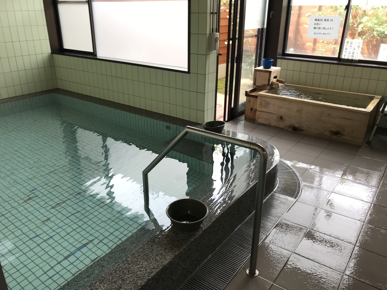 源泉掛け流しの湯と源泉を加熱した湯の浴槽は内湯の2つのみで、温泉施設内は広くはない。