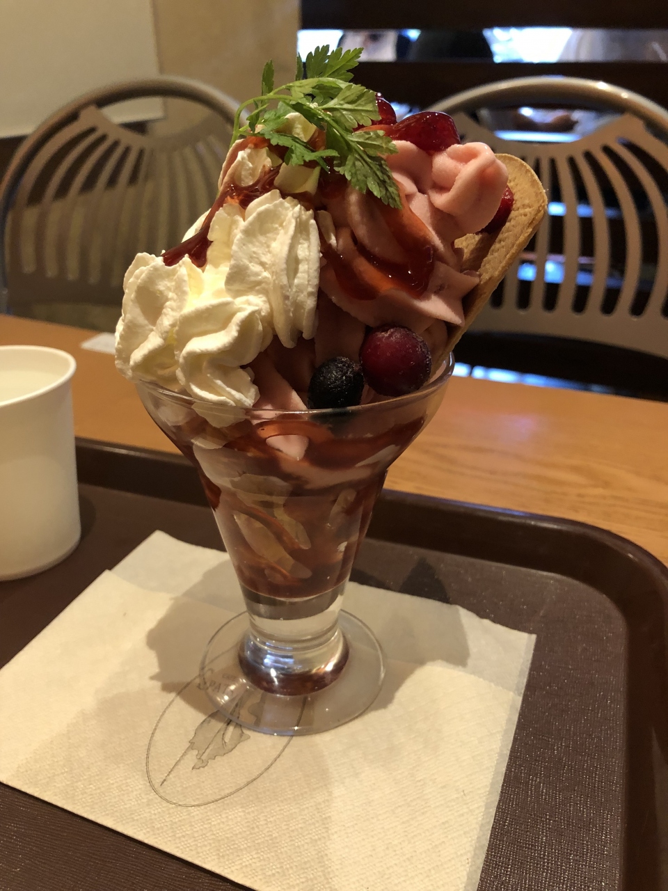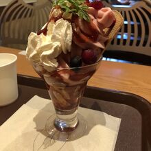 地下一階といってもオープンテラスもあるので地下と言う感じはしません。もっとも外は暑いので室内を利用しました。パフェを注文。先払いですが、商品は席までもってきてくれました。片付け、水などもセルフです。パフェはごく普通でした。
