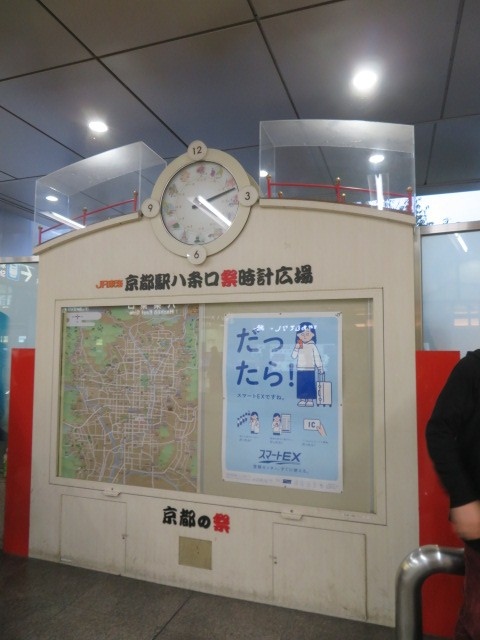 時計広場ということで、どんな時計かと楽しみに行きましたが、見てがっかりです。黄色い壁のようなものの上に小さな時計があるだけです。その壁にちゃんと、「京都駅八条口祭時計広場」と書いてありました。待ち合わせになっているのか、人は多かったです。