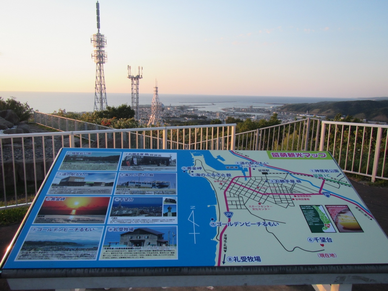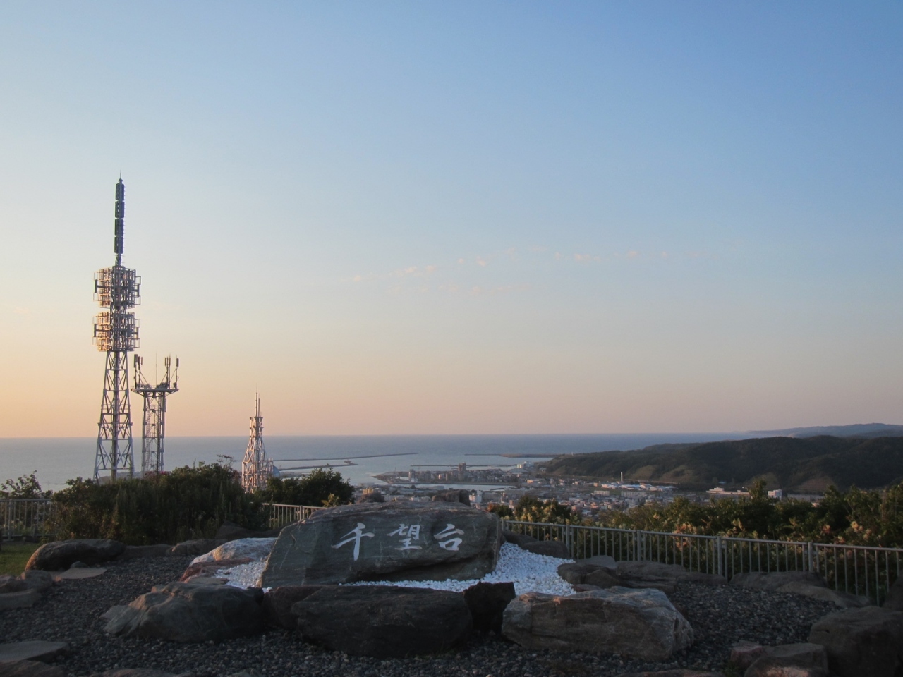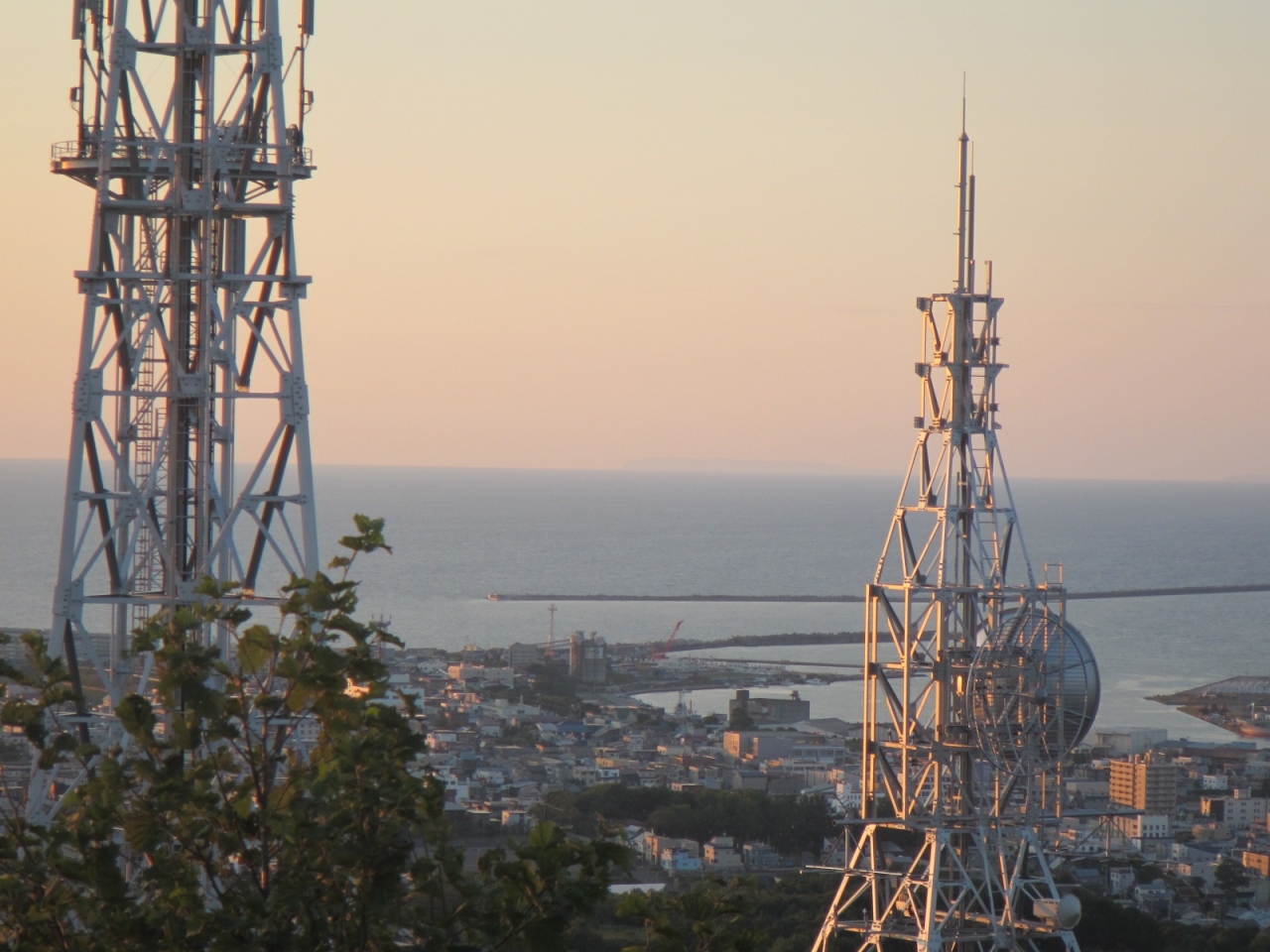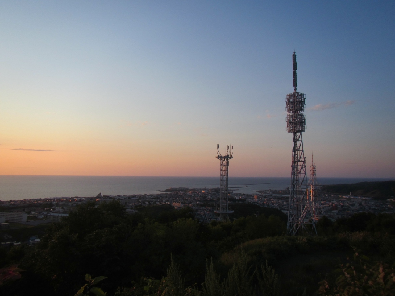 留萌駅からだと、車で13分(3.6km)、市街地からも見えるテレビ塔が建つ標高約180mの丘(山)です。丘上からの留萌市街や日本海の眺望がよく、夕日の時間に訪れましたが、なかなか素晴らしかったです。海上のもやがそれほどでもない日だったので天売・焼尻島の扁平な島影が見えましたが、非常に条件が良ければ、利尻山の島影も見えるそうなので、ぜひチャレンジしてみてはいかがでしょうか。