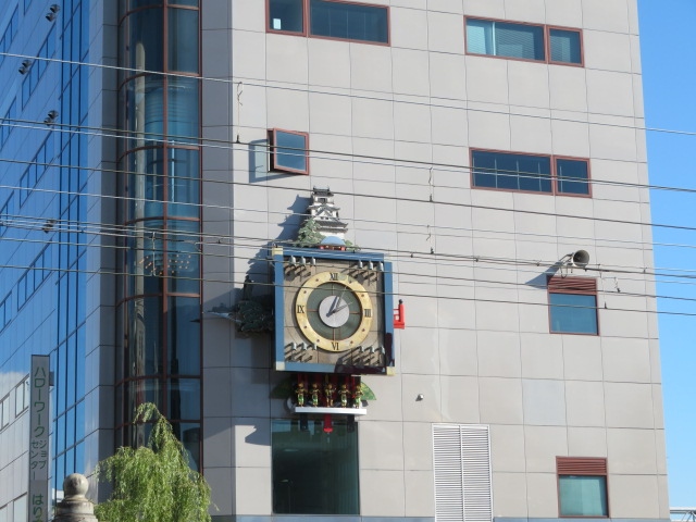 はりまや橋の横に大きい橋が架かっています。その橋をはさんで、はりまや橋と反対側のビルに掛かっています。市電からも見えます。時計の下に踊り子がいて、時計の上には高知城がのっています。毎正時に動きますが、結構可愛いです。はりまや橋も登場します。