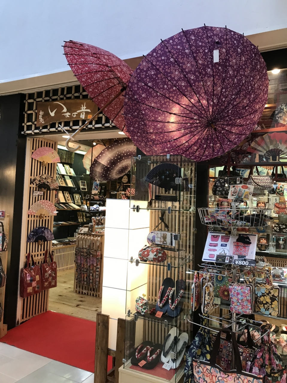 こちらは和風そのもののお店です。ディスプレイがなかなか上手で、結構引きつけられていく感じです。傘・扇子・草履など、商品も日本の伝統商品を庶民的に売っています。正面の商品は色合いが派手でしたが、中には落ち着いた色合いのものもありました。