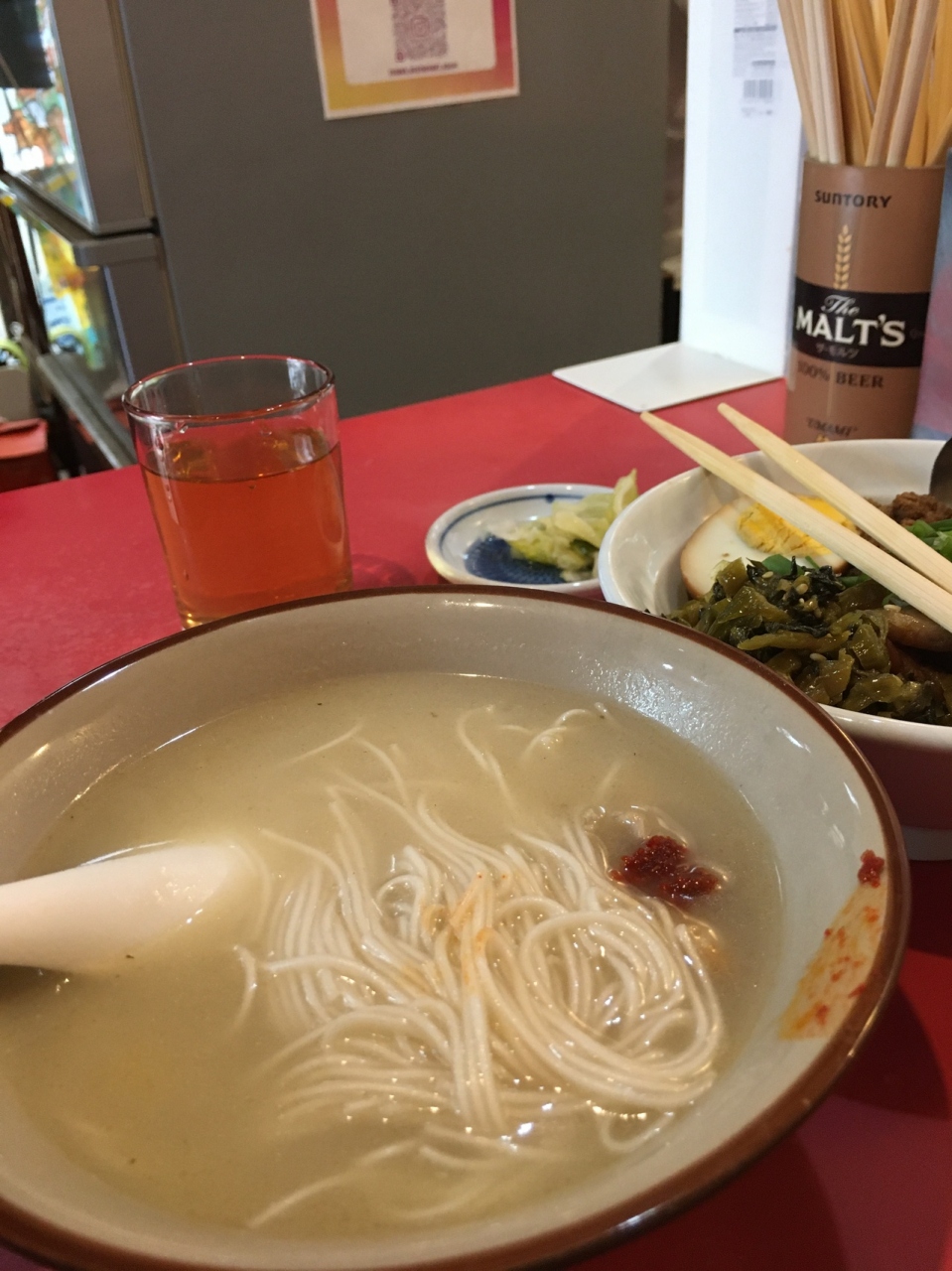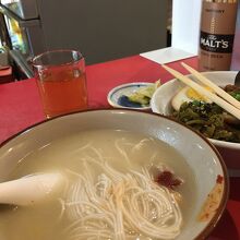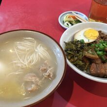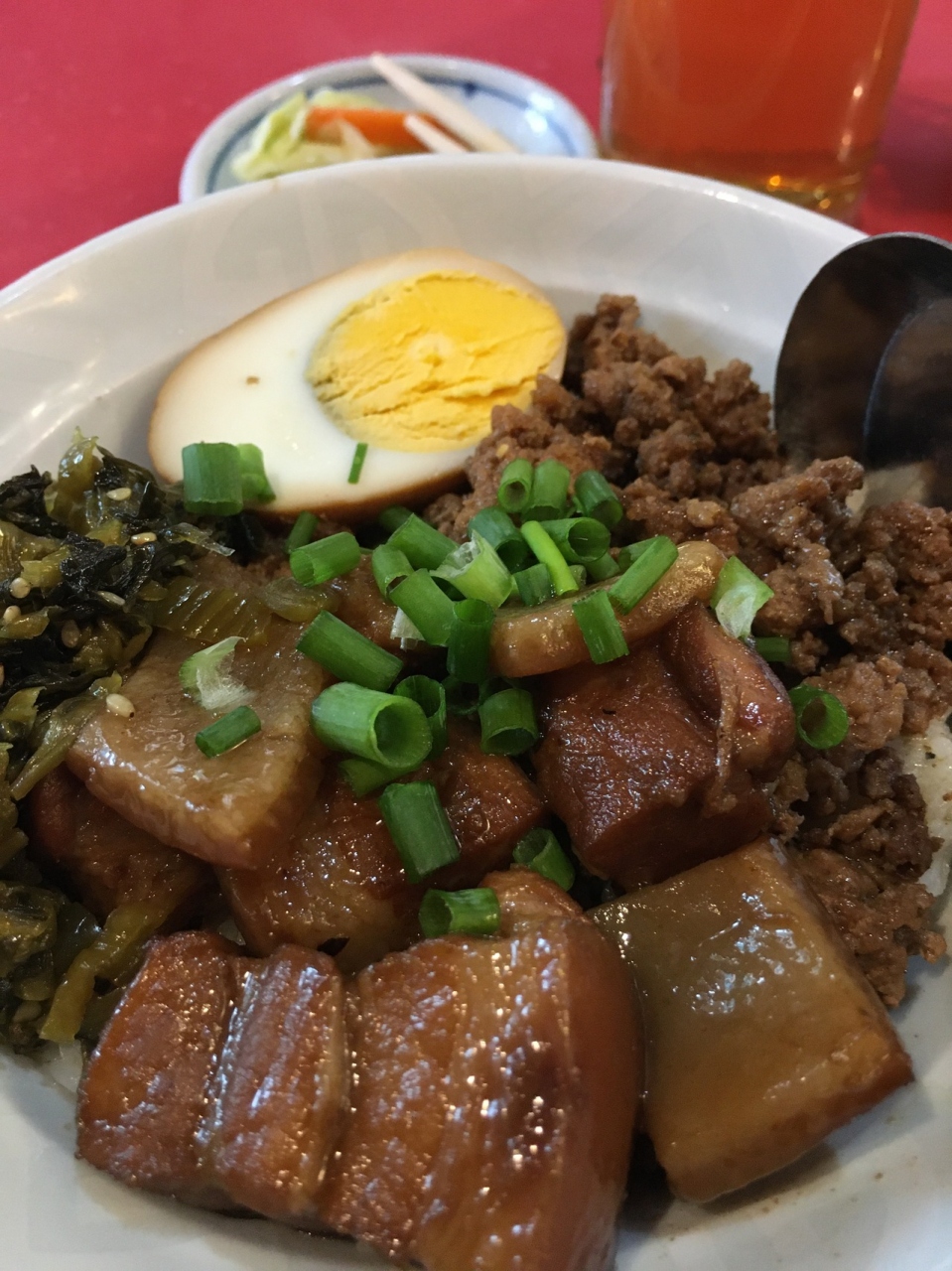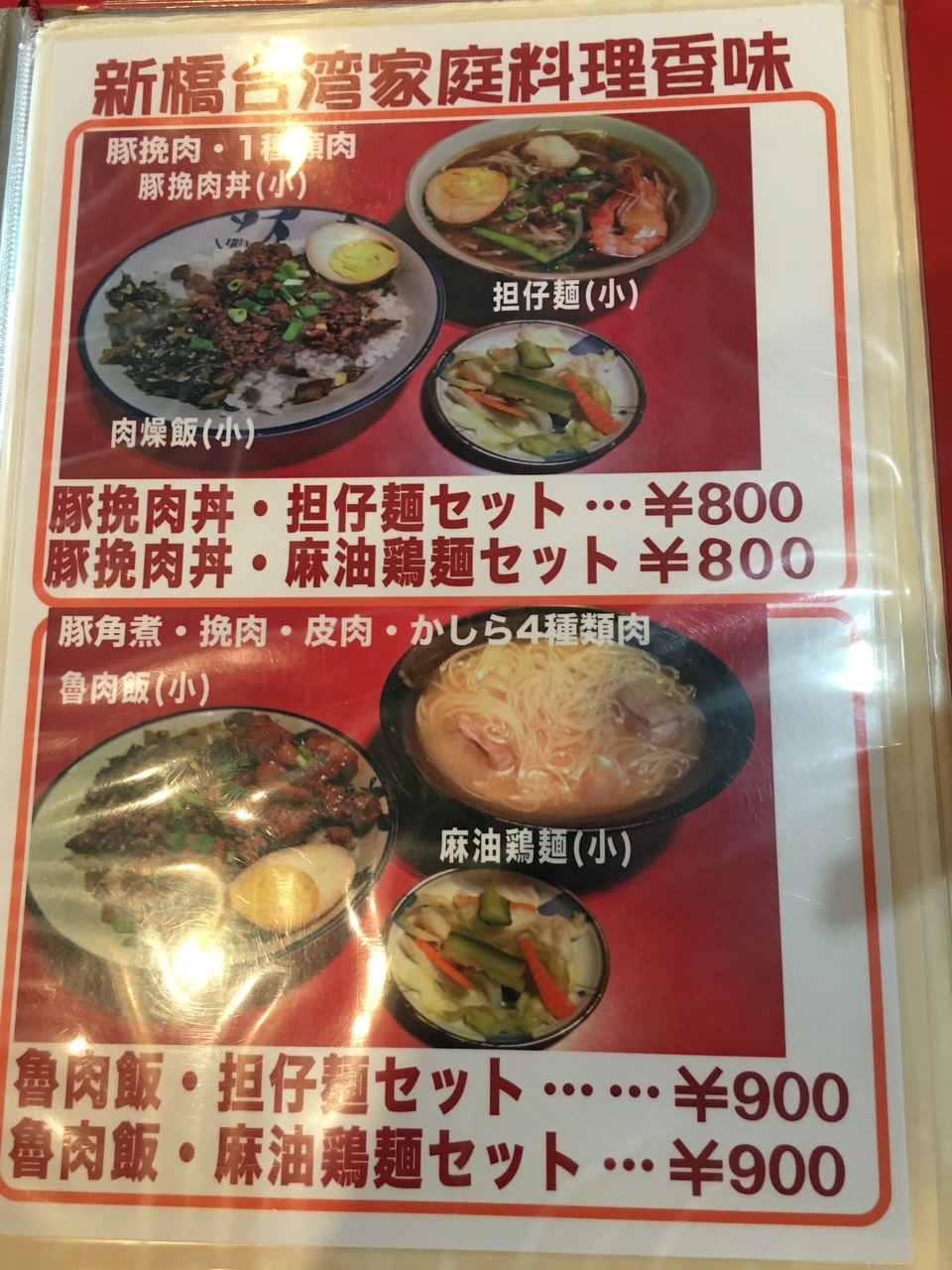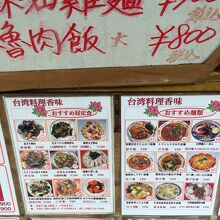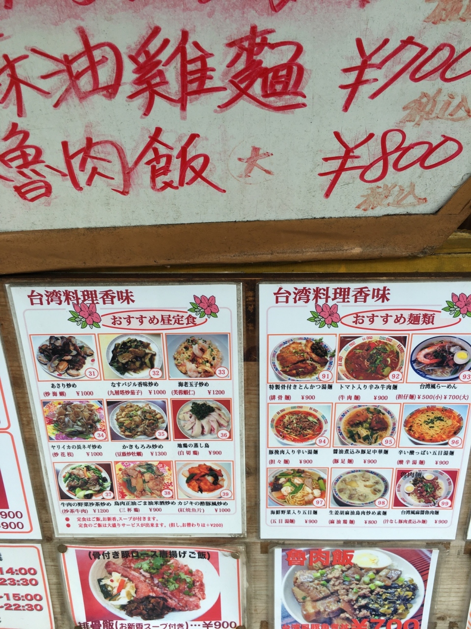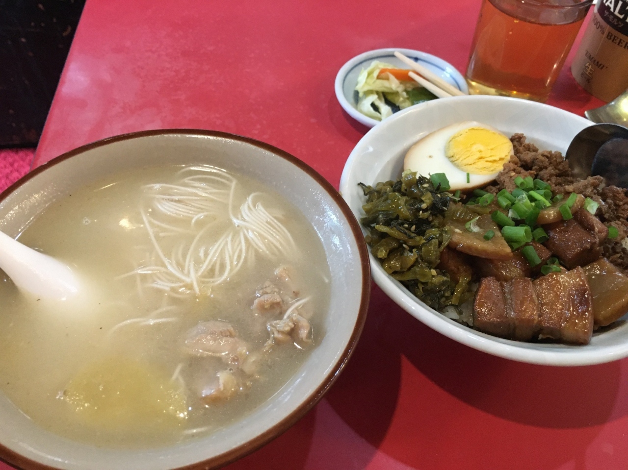 店内の壁はメニューや写真だらけでした。店内に入って知りましたが台湾料理の店で、狭い店内で屋台のような雰囲気でした。店員さんおすすめの料理を食べました。台湾風の味付けで麺と混ぜごはんのような感じで肉が旨かったです。麺は素麺のように細く白く濁ったスープが旨かったです。