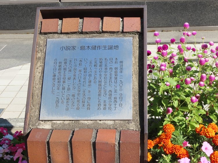 島木健作は札幌市生まれの小説家です。日本が大陸に進出して、戦争へと突き進む時代、転向文学を代表する作家と言われています。札幌市内、こうした地元出身作家の「生誕地」というプレートがいたるところにありますが、そこまで有名、というかよく名前を聞いたことがある人物は少ないです。位置は北1条郵便局の前ですが、こちらもマップのピンが南3条西11という全然違う場所を示しています。登録住所の通りにピンを置く努力さえ感じられない4トラのおかげで、歩数が稼げます。