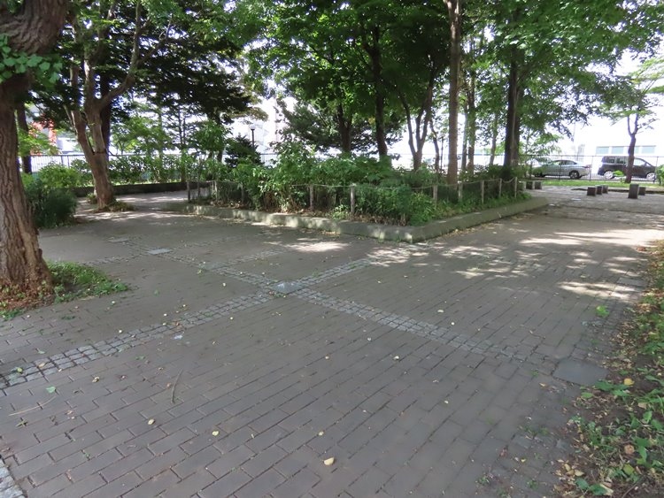 こちらは交差点に面した北6条西13丁目の北東角地にあります。明るいわけでもなく、自然を感じられるほどの規模感もなく、普通の公園のようでいて、緑地としか呼ばれないのは遊具もなく子ども向きではないから、でしょうか。いちおうベンチはありますが、全然魅力を感じない外見の場所です。昔、宮部金吾博士の住居があった跡地なので、あまり手を加えていないということのようです。