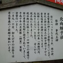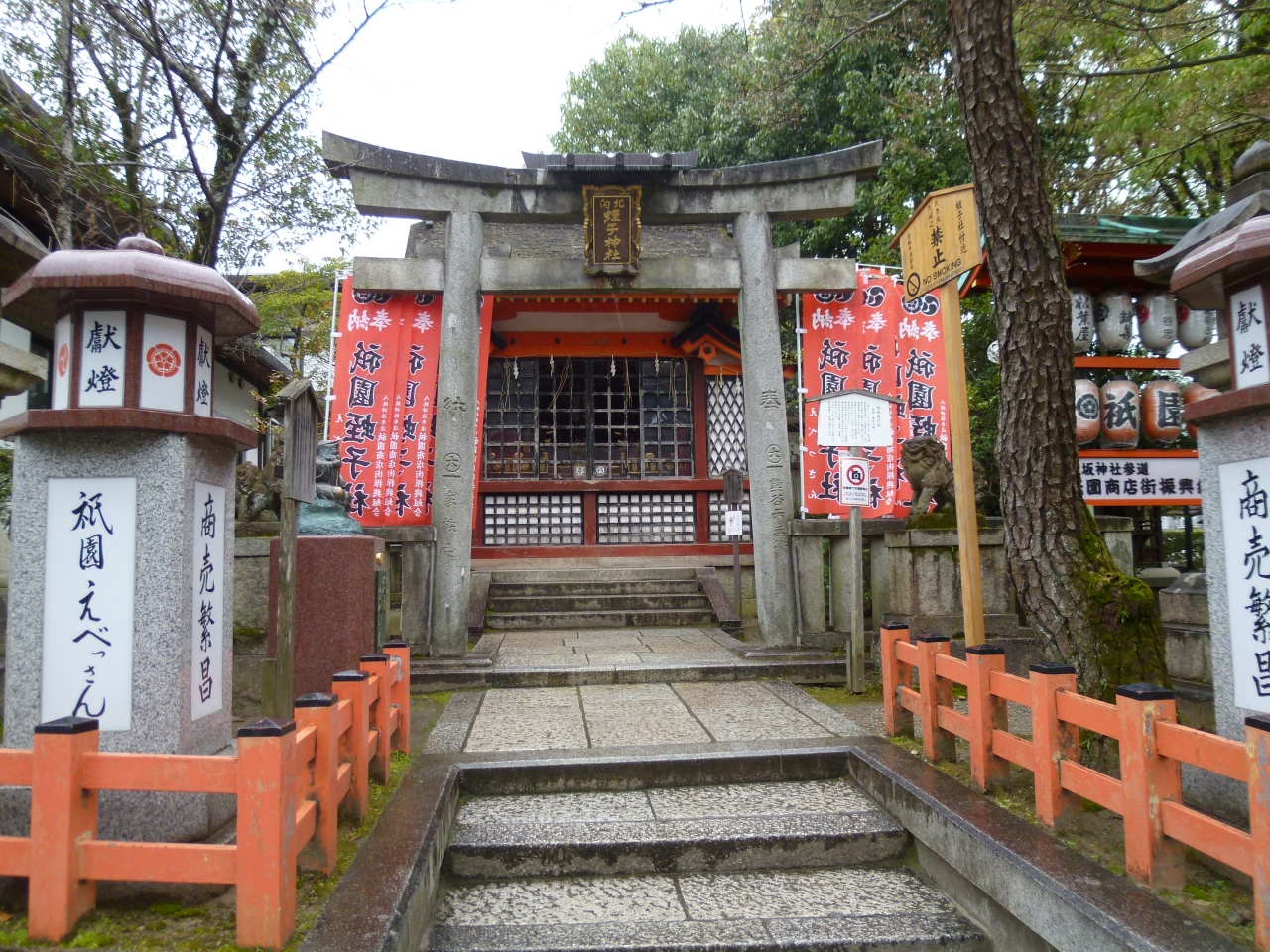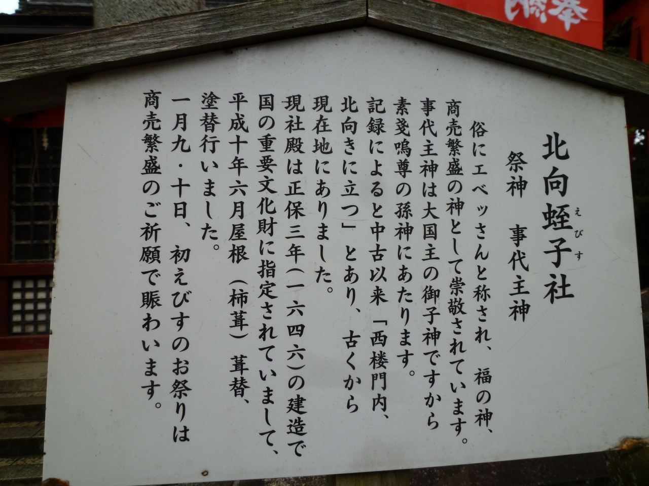 北向蛭子社の祭神は、「事代主神」です。一般には「恵比須様」と呼ばれ、福の神、商売繁盛の神様とされています。にこやかで表情豊かなえびすさま像がいらっしゃいました。事代主神は、大国主の御子神で、八坂神社の本殿に祀られている主祭神である素戔嗚尊の孫神にあたります。例年、1月9日と10日には「初えびす」の例祭が行われています。