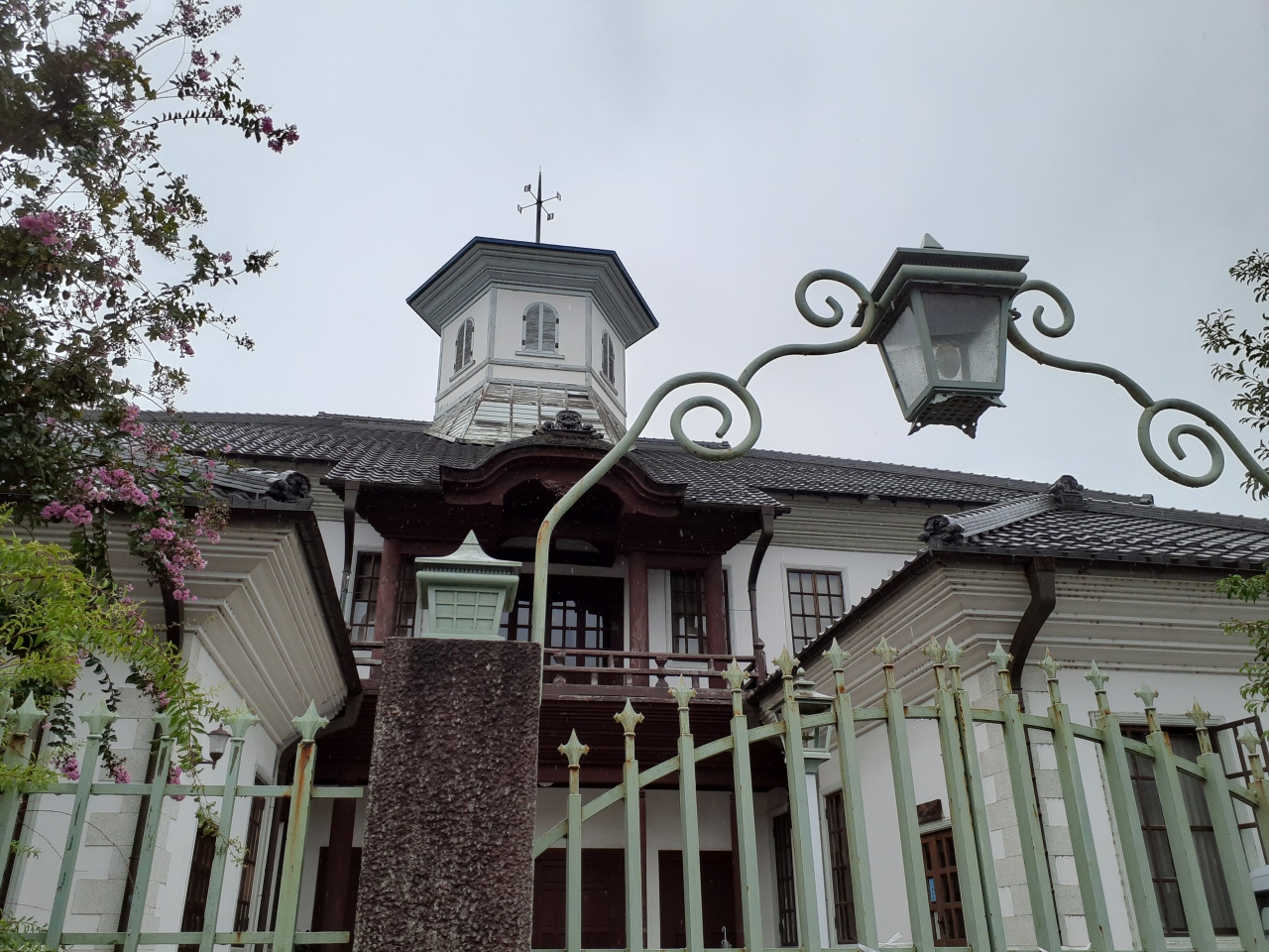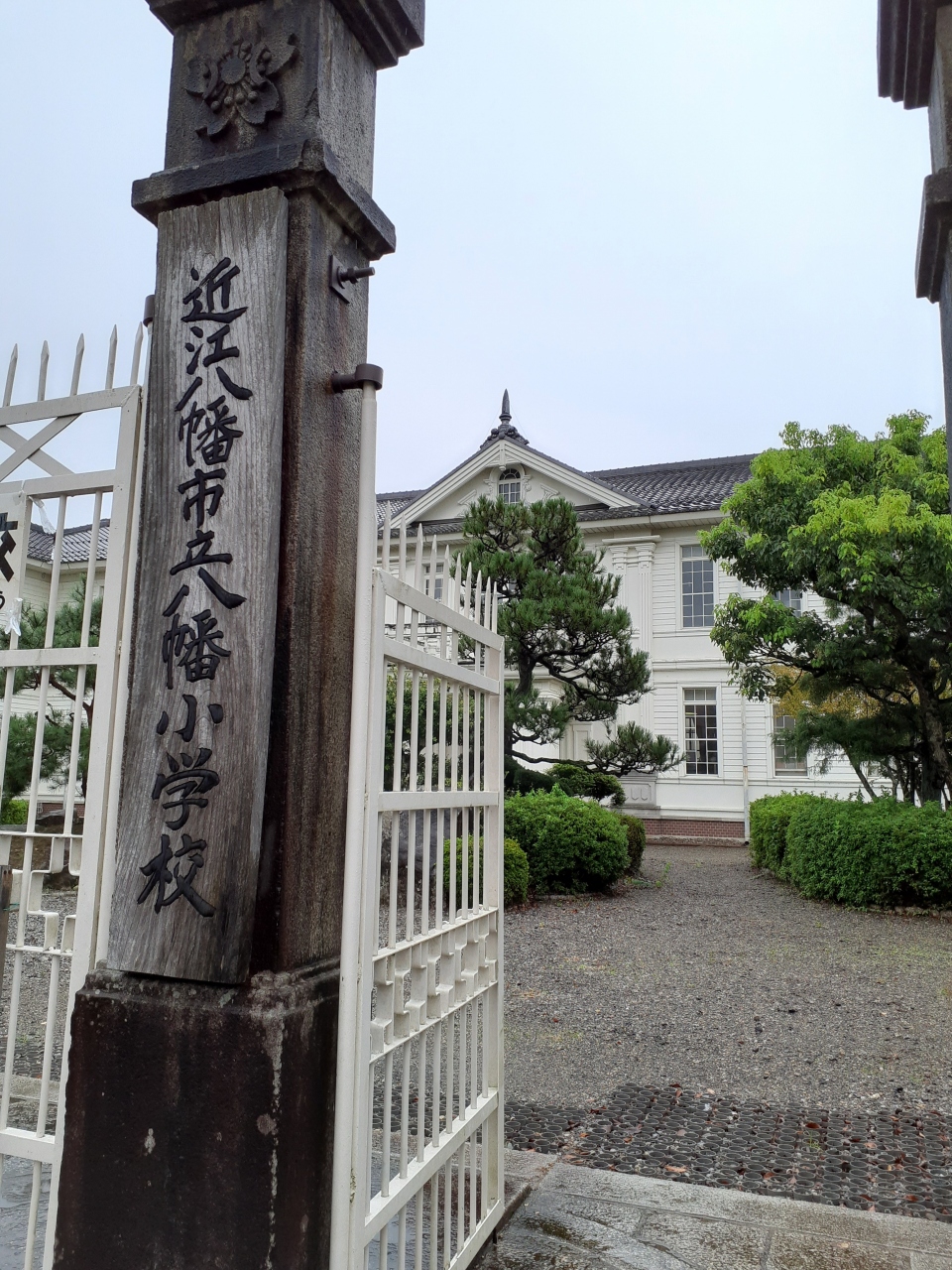 日牟禮八幡宮の鳥居の向かいにある洋風の建物で現在は観光案内所としてりようされています。コロナのため休館中で中に入れず、残念。さらに散策をしていると、こちらは現役で使われてる八幡小学校がありました。こんな素敵な建物で学校生活を送れるなんて羨ましいい。