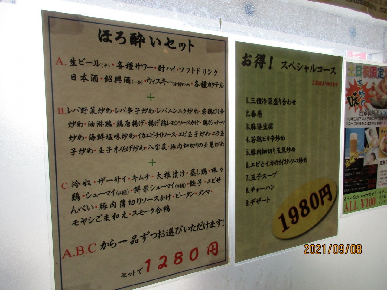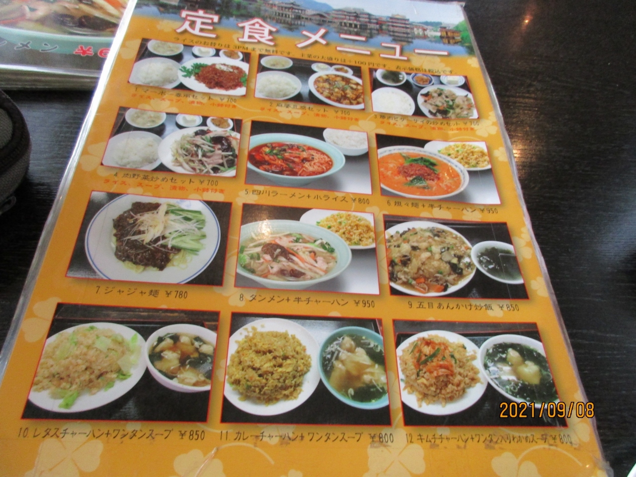 ご飯おかわり自由。定食メニューは700円~800円。麺類・飯類・點心類のメニューも揃っていた。定食メニューから【キムチチャーハンとワンタン入りワカメスープ800円を注文。ボリュームがあり、値段は抑えめという感じだった。11時10分頃行ったが、11時40分頃まで他には客は入ってこなかった。気楽に入れる料金抑えめでボリュームタップリの大衆中華料理店といった店であった。接客は普通であった。