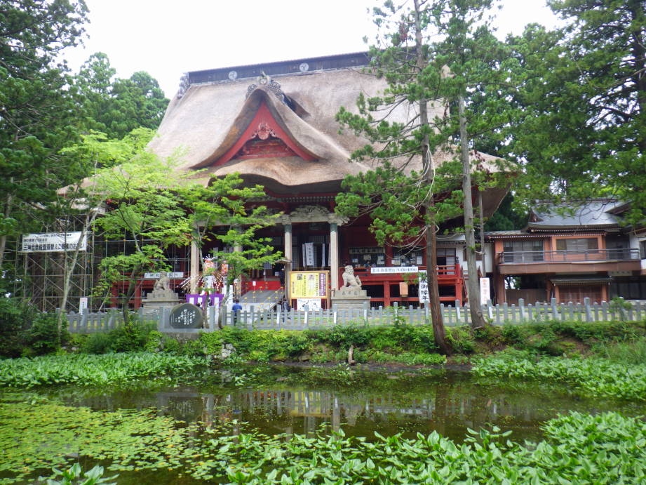 「鐘楼と建治の大鐘」の近くに「鏡池」がありました。古書で「羽黒神社」と書いて「いけのみたま」と読ませていて、この池を神霊そのものと考え篤い信仰の捧げられた神秘な御池だそうです。「三神合祭殿」が鏡のように映るのかと思っていましたが、水草が一杯であまり綺麗には見えませんでした。それもそのはず、古来より多くの人々により奉納された銅鏡が埋納されているので鏡池というのだそうです。