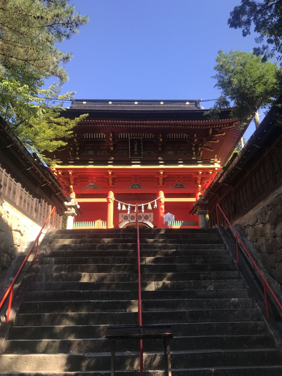 松並木の参道を進み、駐車場に車をとめ、鳥居をくぐって手水舎を過ぎると、左手に現れるのが、楼門に続く石段で、その急確度に驚かされます。