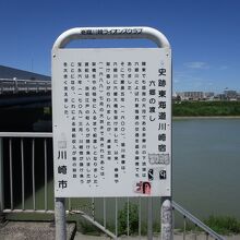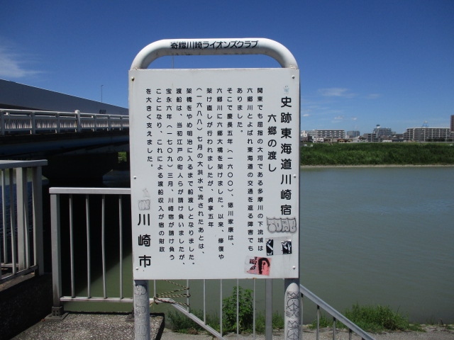 京急川崎駅から駅前交差点を左折し砂子交差点を左折し旧東海道を多摩川方面に進み第一京浜高架下を潜って左に曲がると川岸にある六郷の渡し跡に歩いて10分ぐらいで着きます。慶長5年に六郷川に六郷大橋が架けられましたが洪水で流され明治に至るまで渡し船が続いていたそうです。宝永6年3月に川崎宿が請け負うことになり渡船収入が宿の財政を大きく支えたようです。現在は渡船跡の碑と明治天皇六郷渡御碑が建ち欄干に渡船のモニュメントがあります。眺め良いので気持ち良かったです。