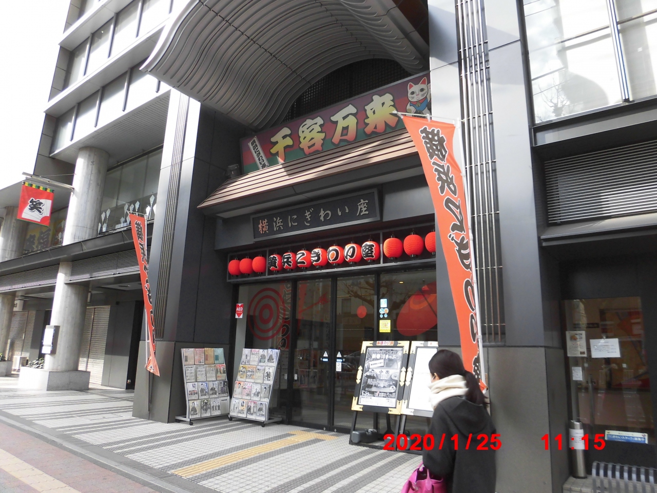 神奈川県横浜観光で立ち寄りました。JR桜木町駅から野毛ちかみちショッピングモールをぶらぶらしながら、平戸桜木通りを道なりに南に数分進むと右手に「千客万来」の大きな看板がかかった横浜にぎわい座がありました。残念ながら開園前だったので誰も居ませんでした。