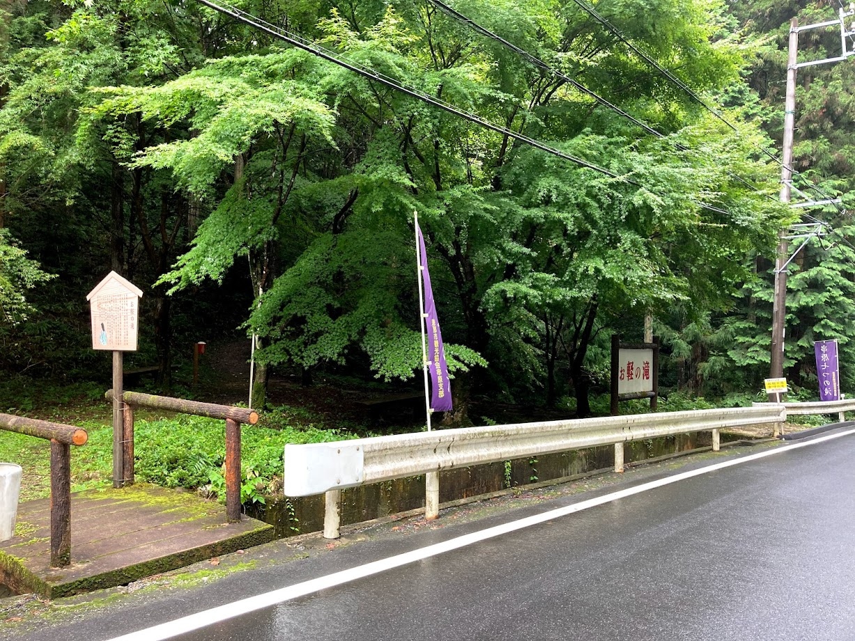カーナビが案内したところは、看板もなく、下に降りたら丸太を渡るようなすごい道で、滝は見えるのだけど行きつけなくて、絶対違うと引き返して、行ったり来たりしながら、結局、行き過ぎたところに紫色の「串原七つの滝」の幟と看板がありました。広めの駐車場もありました。