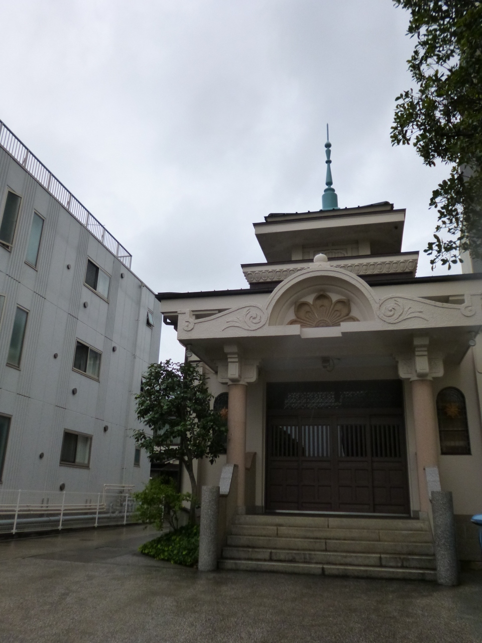 三田4丁目を走る裏通り「聖坂」沿いにあるお寺のひとつです。こちらは浄土真宗本願寺派寺院で、すぐ隣には、浄土真宗系単立寺院の「荘厳寺」があります。同じ浄土宗寺院でも二つのお寺の本堂は外観的に大きく異なります。常教寺の本堂は白を基調とし、小さいながらもインド様式を感じさせるインパクトの強い外観でした。