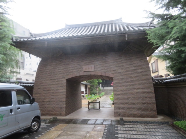 浅草通りの北、かっぱ橋の西、松が谷の住宅街にある曹洞宗の寺院、山号は萬年山、本尊は釈迦如来、太田道灌が開基しています、天文20年(1551年)か、弘治2年(1556年)の創建で祝言村で建立されてその後現在地に移動しています、境内を入ると変わった山門がありました。