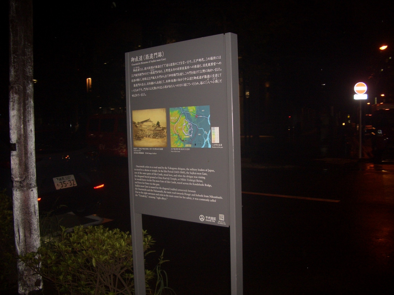 9月に近辺を散策した時に、御成道(筋違門跡)の看板があるのを見つけました。説明文と地図、古い写真からなるものでした。御成道とは、徳川将軍が上野寛永寺の将軍家墓所、日光東照宮への参拝の時に通る道とのことです。