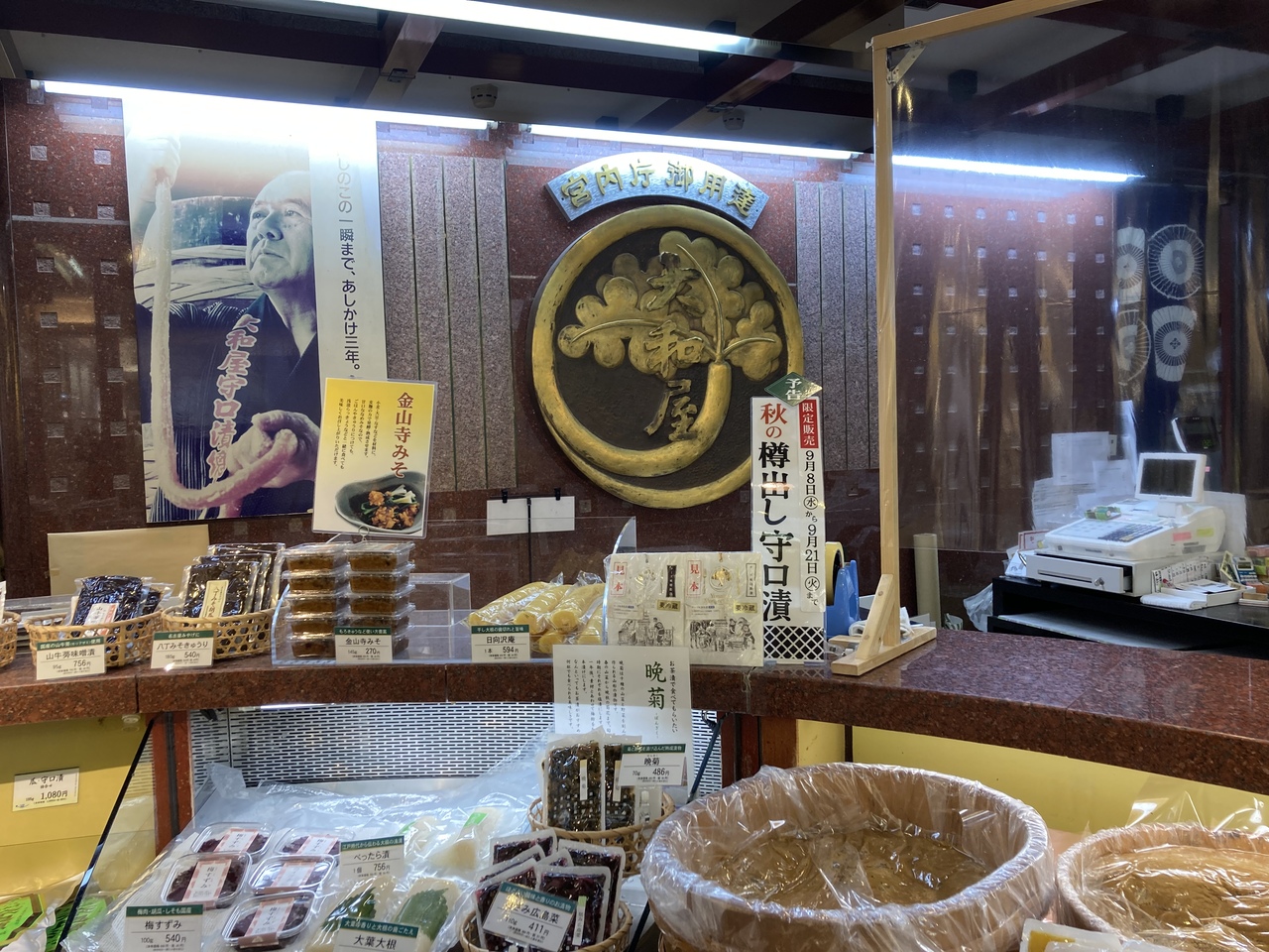 エスカの中で食事をしようと思って歩いていて、たまたま見つけたら、守口大根も飾ってあり、是非食べてみたいと思って守口漬けを頂きました。東京都内では都心の一部のデパートでしか入手できない貴重な大根だそうです。