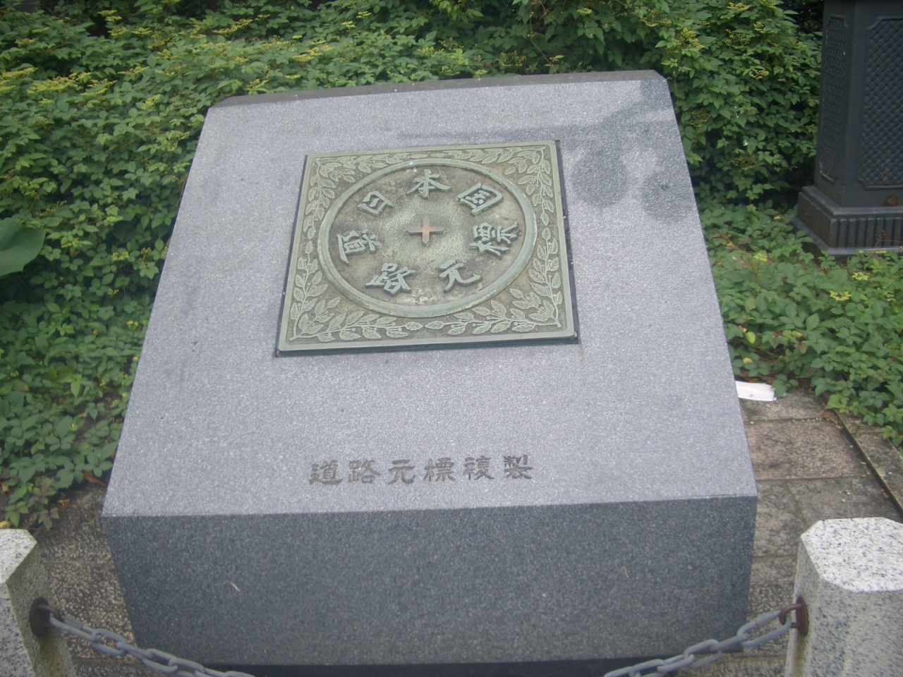 日本国道路元標は、日本橋川に架かる日本橋の上にあります。そのレプリカが橋の袂に、東京市道路元標と共にあります。道路元標は、道路の起点となるポイントです。日本橋にあるのは、江戸幕府が定めた5街道(東海道、中山道、日光街道、奥州街道、甲州街道)の起点を明治政府が踏襲したものとのことです。日本橋は、江戸時代から日本の道の起点です。