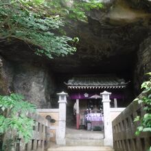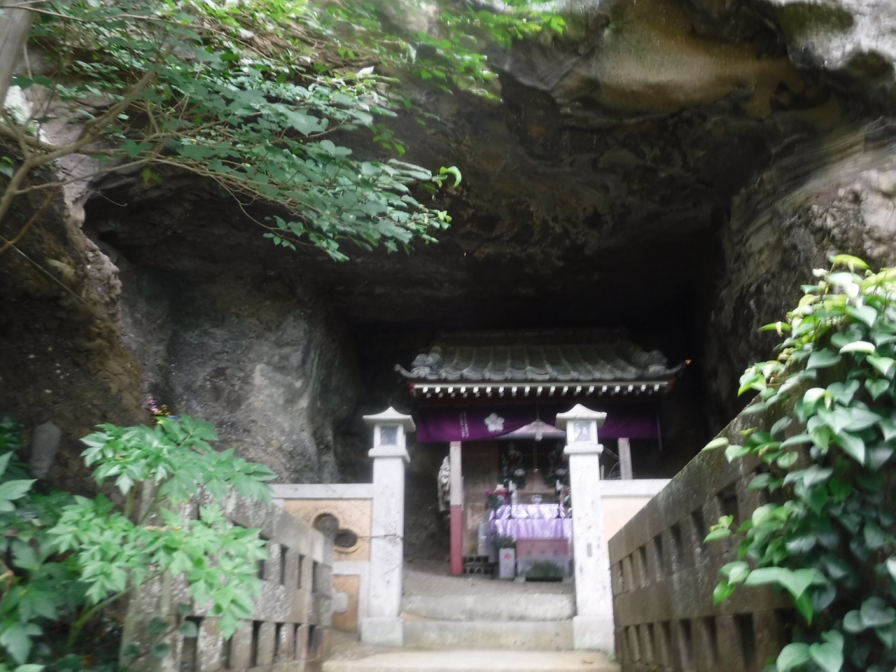 お墓の先に洲崎神社へ続く獣道のようなところを進むと洞窟の中に祠がありました。