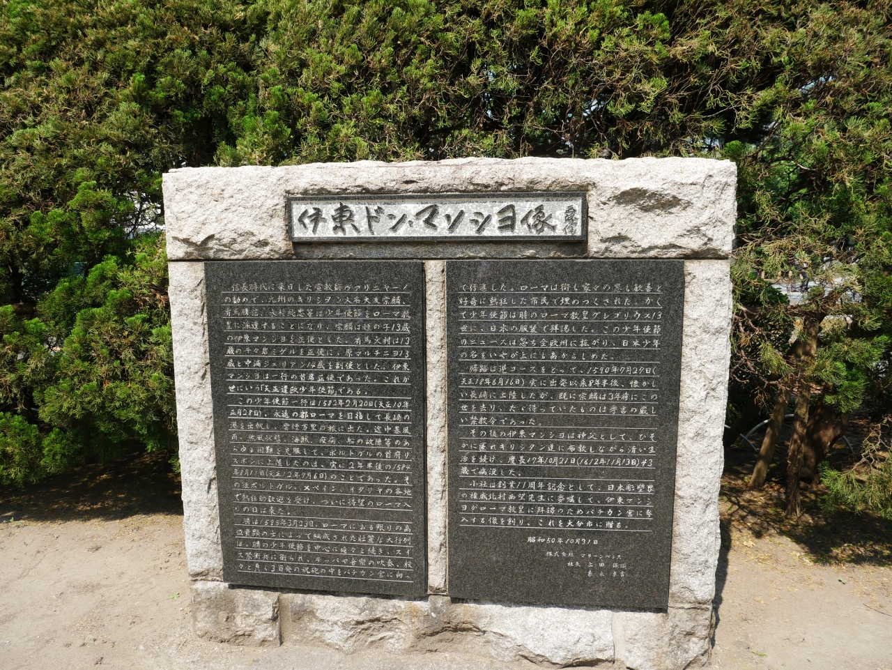 伊東マンショと言えば、天正遣欧少年使節団の一人(といっても、伊東マンショ以外は名前もしりませんが)で、大友宗麟の命で遠くヨーロッパまで行った人物ですよね。像の側にも、その辺の説明がしっかり書いてありました。