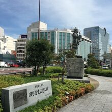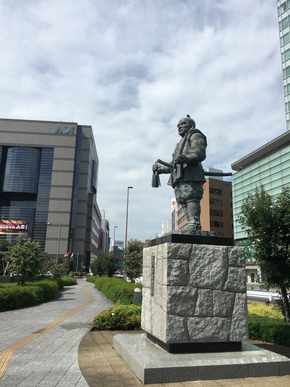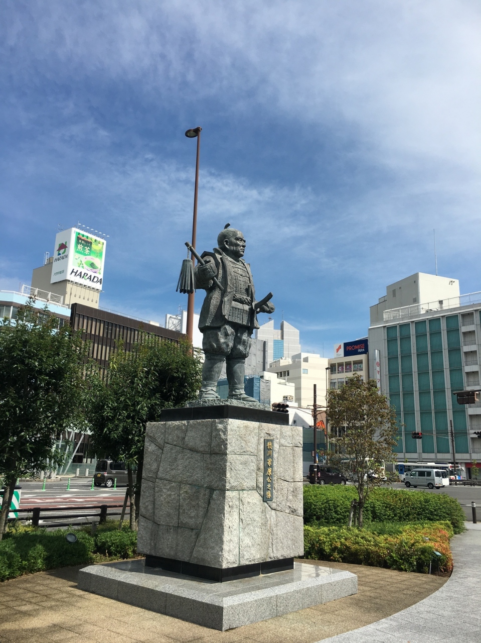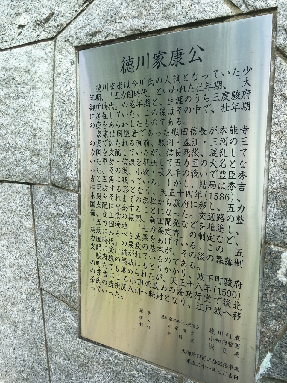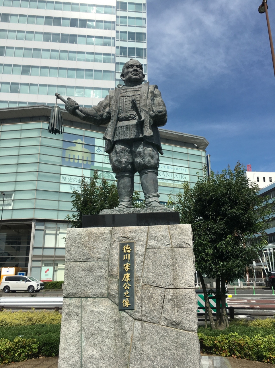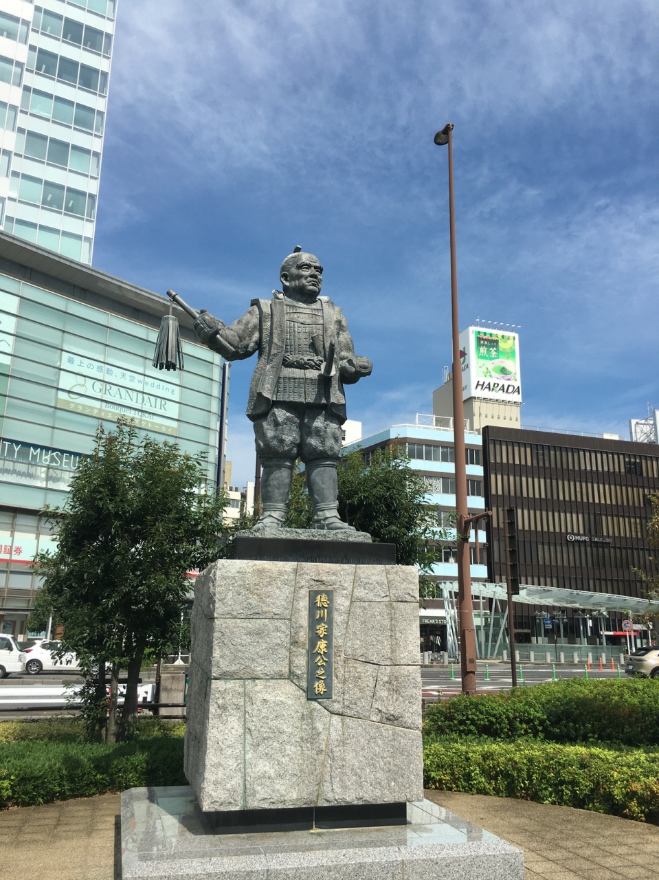 流石、家康像だけあって立派な像でした。石台にのり、精悍な武将姿で軍を指揮しているような顔立ちでした。背丈は低く見えました。徒歩1分ぐらいのところに幼少期の竹千代像と今川義元像があり、其方を見つめているようにも見えました。