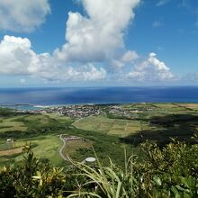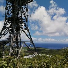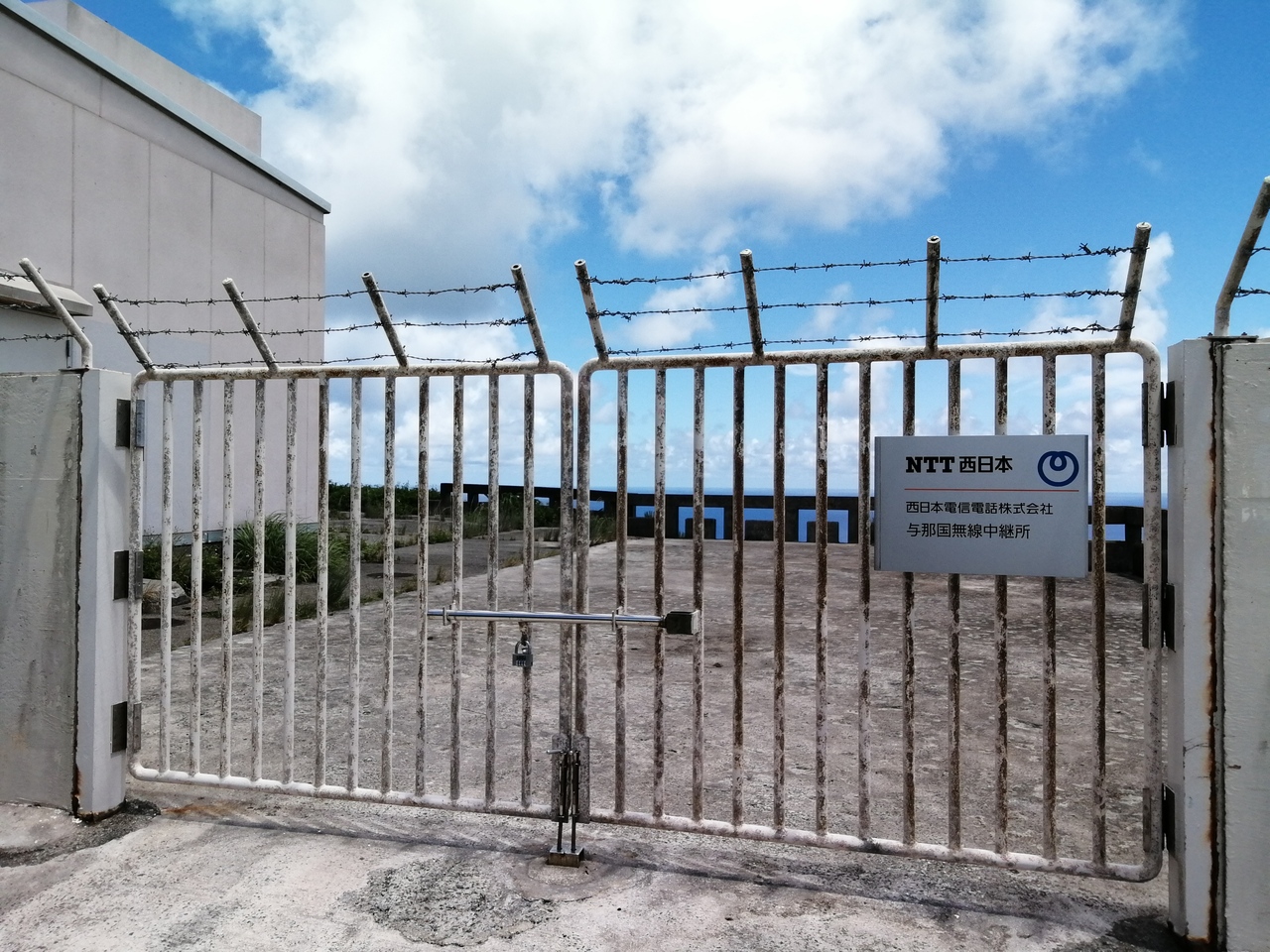 頂上にはNTTの中継所と鉄塔のみ。展望台はありません。本当の頂上は中継所の手前15mにある階段を登り、草むらの中を約40m歩いた地点。三角点があります。草の隙間から空港や祖納の町、ナンタ浜が見渡せます。