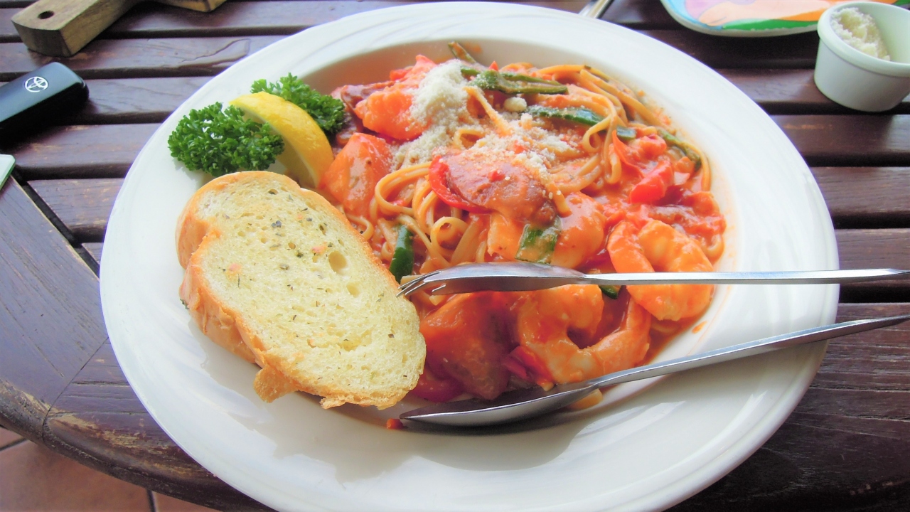 嘉手納基地内にあるレストランです。基地内のため、軍服を着たお客さんも普通に食事をしています。料理は、思っていた以上に美味しいですが、会計時のチップが必要です。