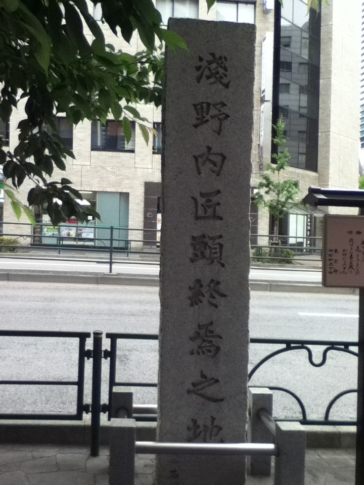内幸町駅南西の歩道上にこの石碑がある。お勧めの点は、石碑はかなり大きく立派で名称がはっきりと刻まれていること、江戸時代この辺りは奥州一之関藩(岩手県)田村右京太夫の上屋敷があったこと、内匠頭は江戸城松の廊下での刃傷沙汰があったその日のうちにこの屋敷で切腹させられたこと、この石碑の横に説明板があり辞世の句「風さそう花よりもなほ我はまた春の名残をいかにとやせん」が記されていることである。訪問時の感想は、人通りは少なく、説明板を読みこの地で内匠頭で自害したことを知りまたゆっくり石碑を見ることができ訪問して良かった。