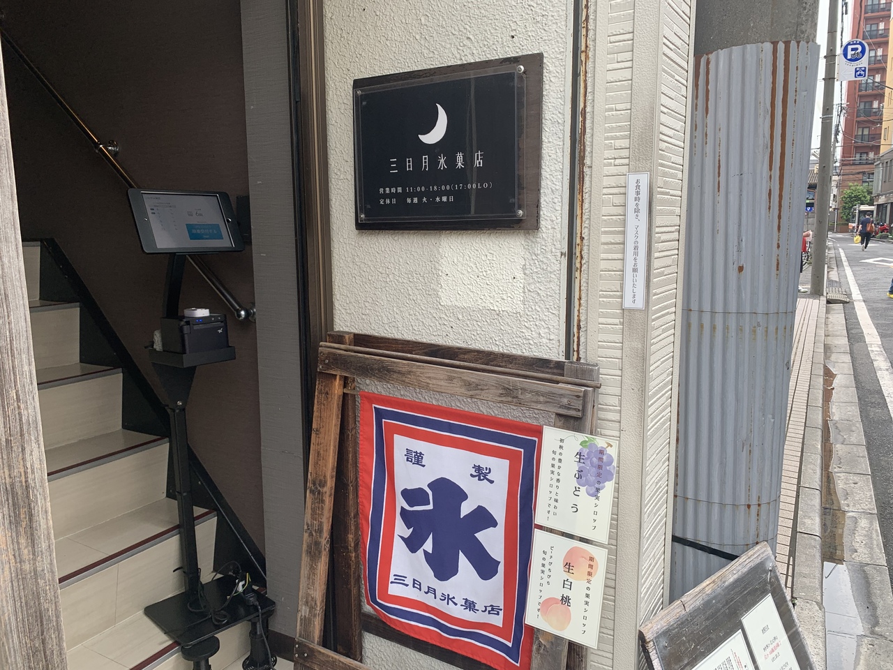 開店15分前にお店につきました、お店に上がる階段のまえに整理券発行の機械がおいてあるので、そちらで整理券を貰います。すでに初回入店5組分の整理券は発行が終わっていて次の組となりました。何番まで進んでいるかはQRコードで確認できます。