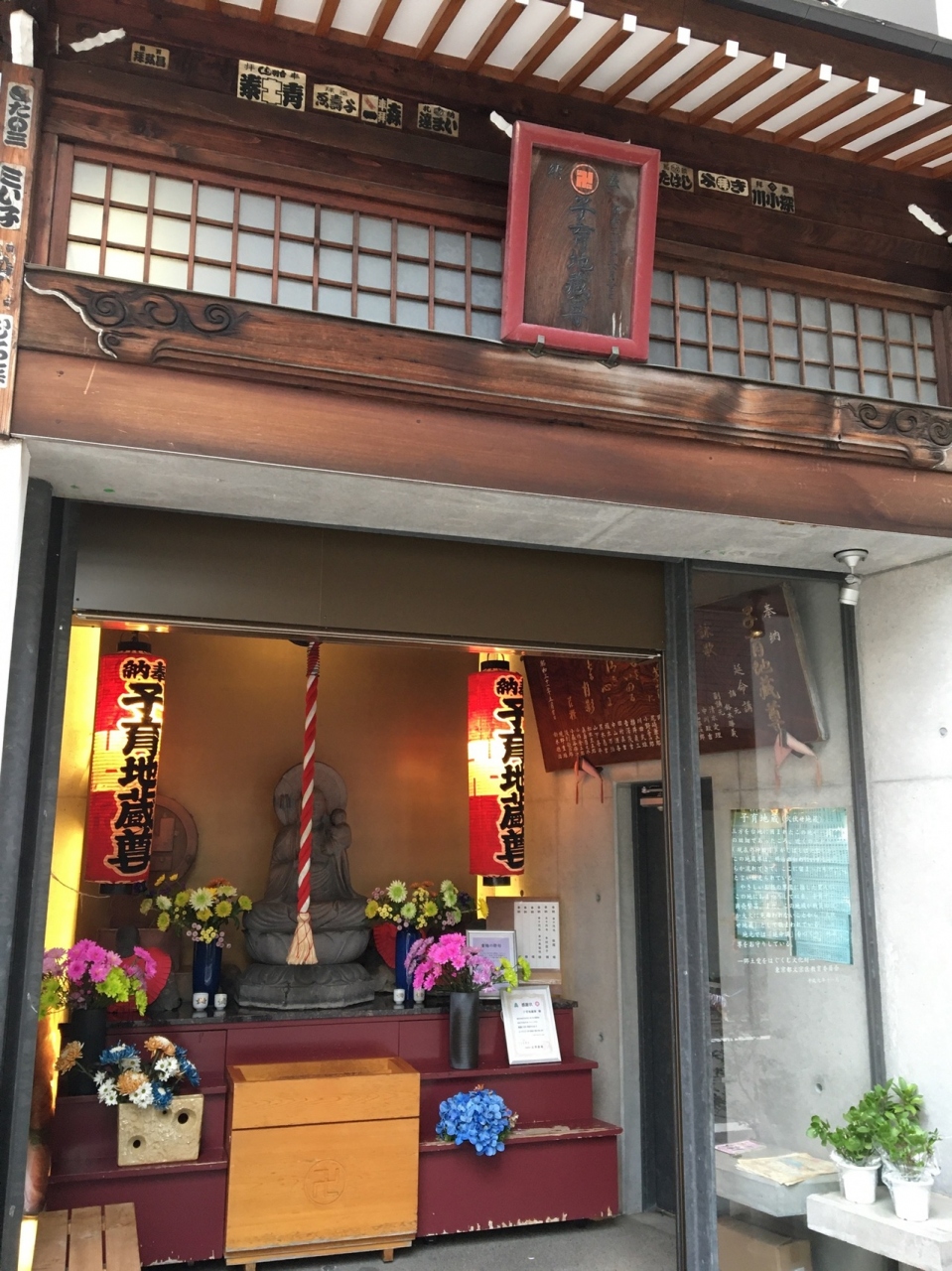 江戸川橋通り沿い、地蔵通り商店街の西側の入口にあります。まだ新しそうなコンクリート製の壁に、歴史がありそうな屋根が乗っているお堂でした。小さな子供を抱えた、優しそうなお顔のお地蔵さんがお堂の奥に鎮座していました。