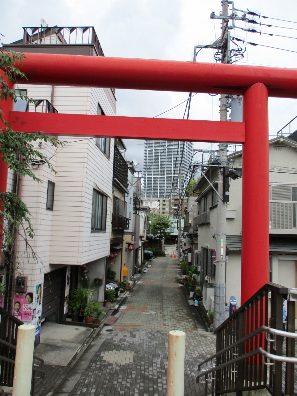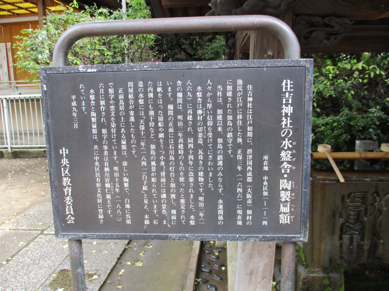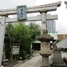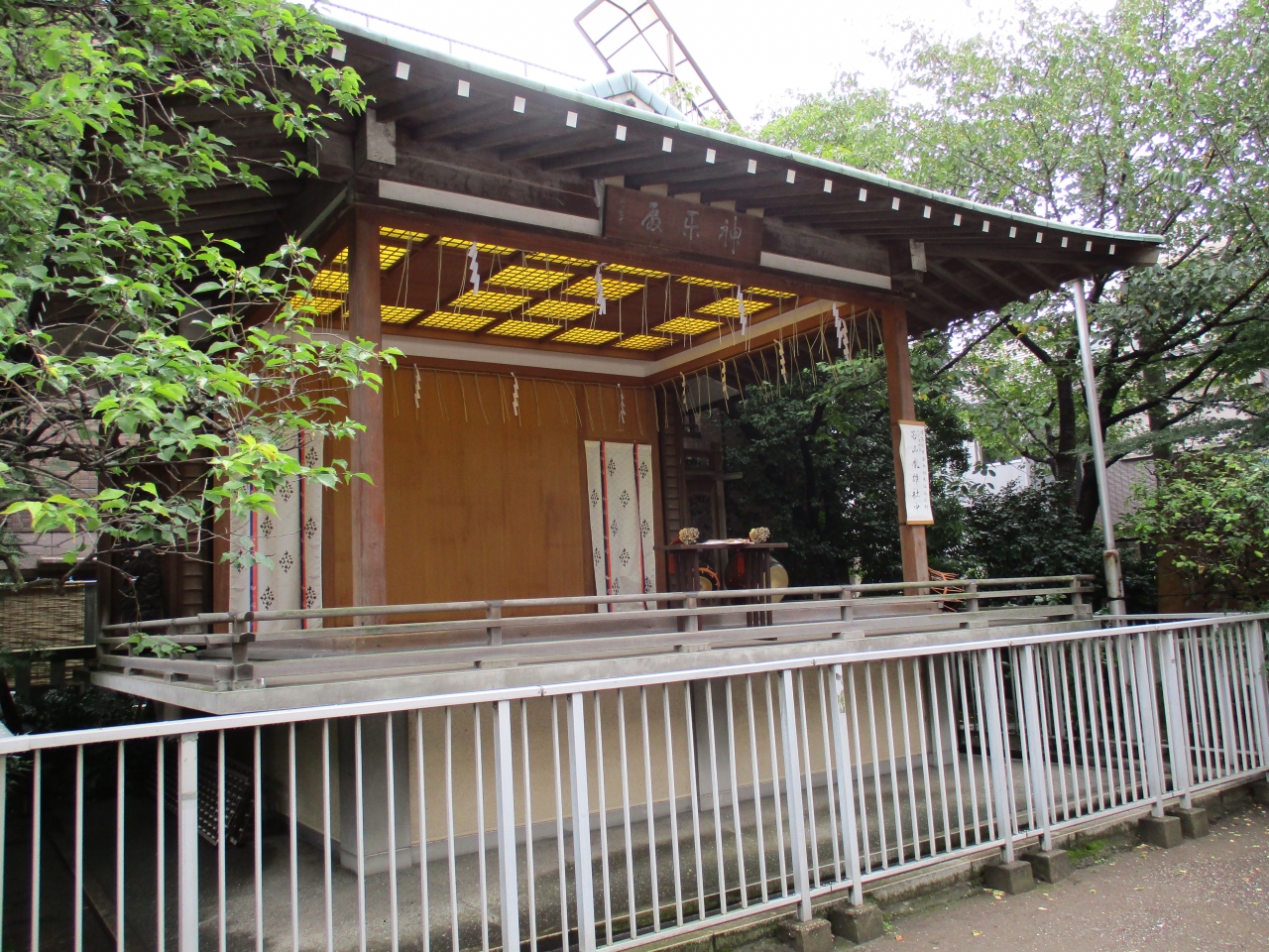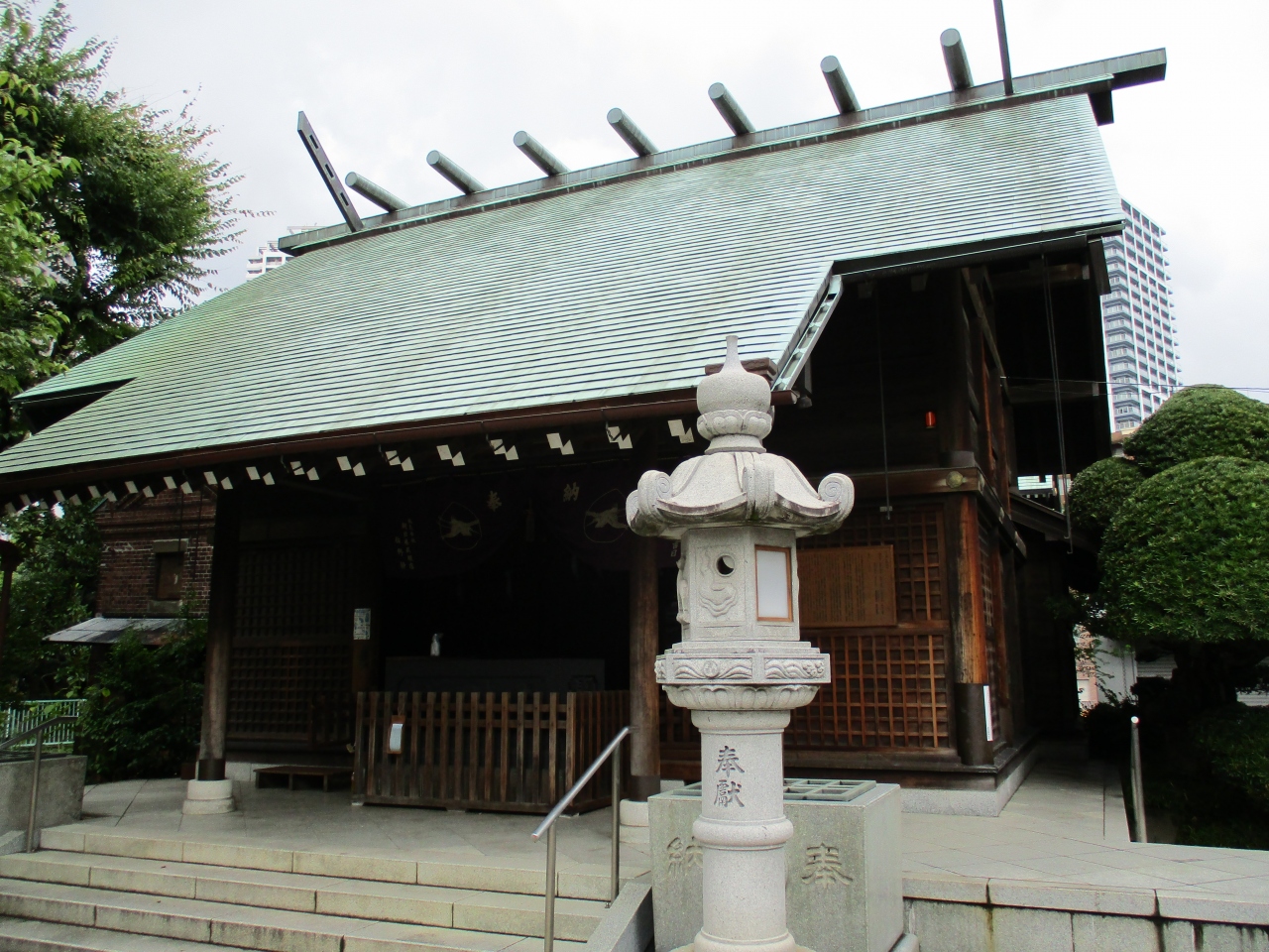 佃島の中を散策している時に立ち寄った神社です。鳥居の上には明治のころの陶器製の扁額があって、地震などで壊れずによく残っているものだと感心しました。境内はそれほど広くはありませんが、それでもお神楽の舞台も建てられていました。