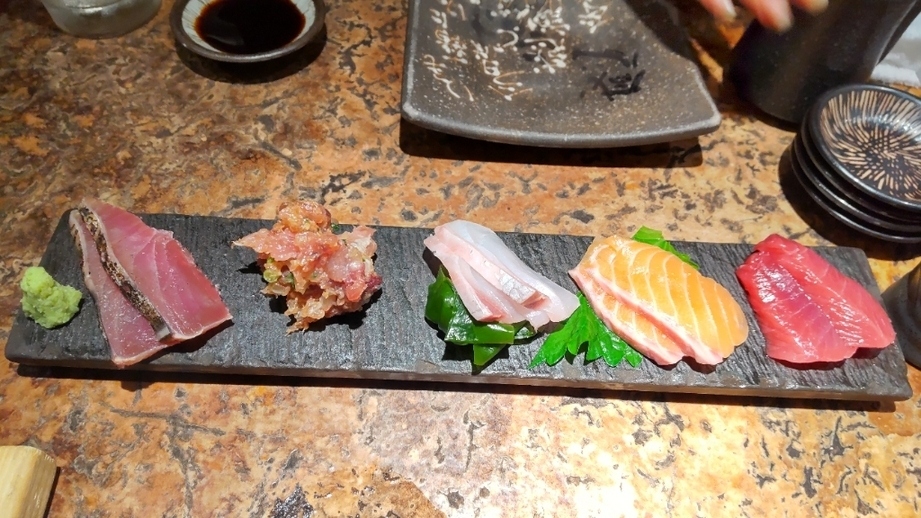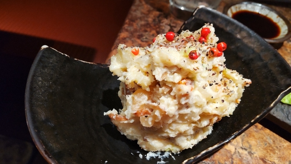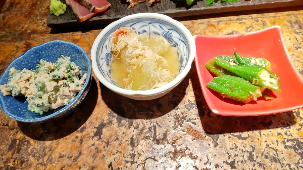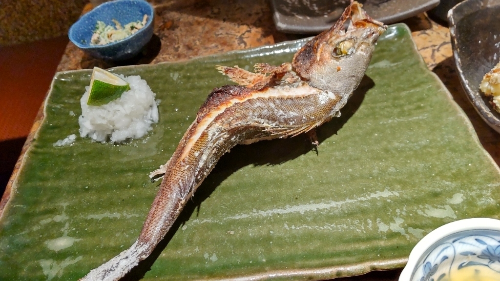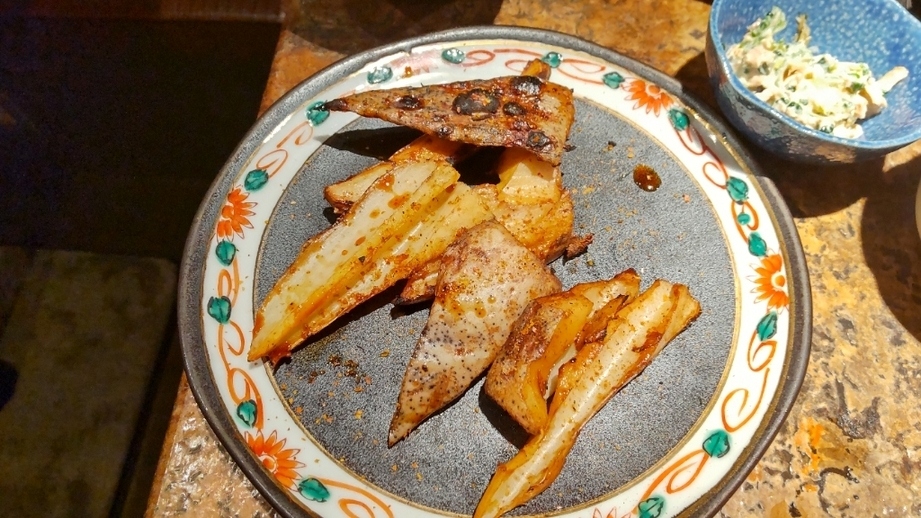 料理は前菜3種盛り、イサキの塩焼き、人気のポテトサラダ、そして蓮根を注文した。