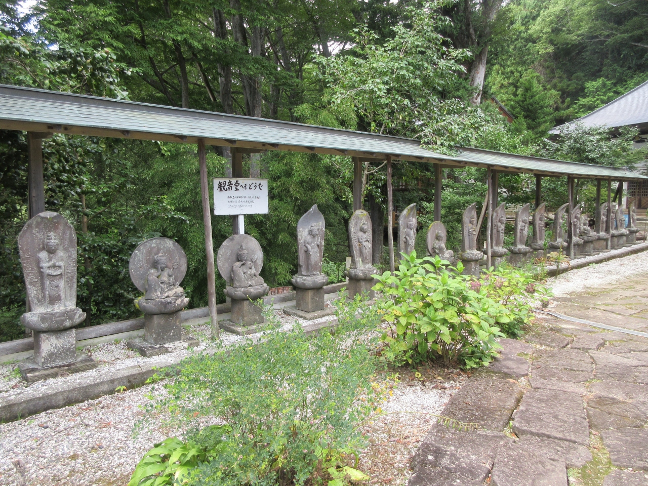 国道20号線から清里ラインを通り、有名な津金の三代校舎の前から数分山に上っていったところにある臨済宗寺院です。717年に創建され、1300年代に臨済宗に改め、織田軍により焼き払われ、徳川家康が再興を命じた歴史ある寺院です。山道に入る道路わきに山門の石柱があります。3分ほど上がった狭い空き地に車を停めました。木造の光陽関から仁王門へ進むと鐘楼門があります。鐘楼門の周りから屋根で保護されている石仏群が本堂横まで安置されています。石仏の中には欠けたものや苔が生えているものもありました。本堂左奥の石段を上がったところにある観音堂は見ごたえある造りと彫物です。1845年に諏訪の立川和四郎富昌らが竣工した厳かなお堂です。彫物が見事です。本堂左にある瞑想参禅舞台のベンチに座り、モミジや竹林越しの遠くの里を見ていると心穏やかになってきました。入口に観光寺ではないなどの注意書きがあり、檀家以外に開かれていないのかと危惧しましたが、本堂周辺に観音堂や舞台を訪れるよう案内板があり安心しました。静かな山中に建つ寺院で、石仏や観音堂を見て、舞台で瞑想できて訪れてよかったです。静かに訪れたい寺院です。