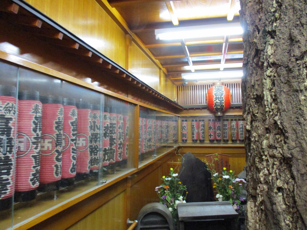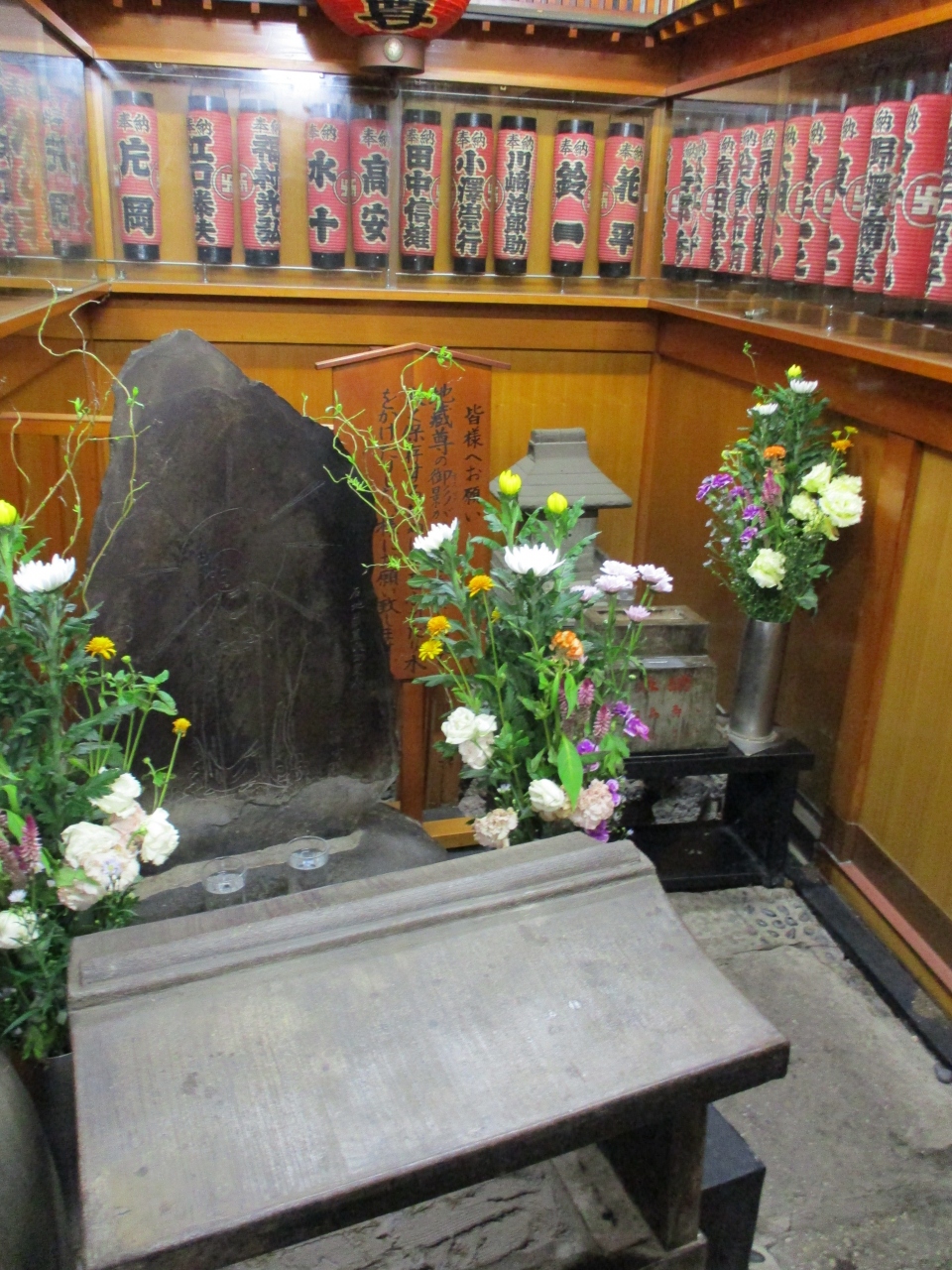 佃島を散策していた時に、赤い幟端に気が付きました。人一人がやっと通れるような細長い路地の奥に、お地蔵さまの姿を記した石が祀られていました。周りには赤い提灯で囲まれていて、お供えの花も添えられていました。とても大切に守られている地蔵尊だと思いました。