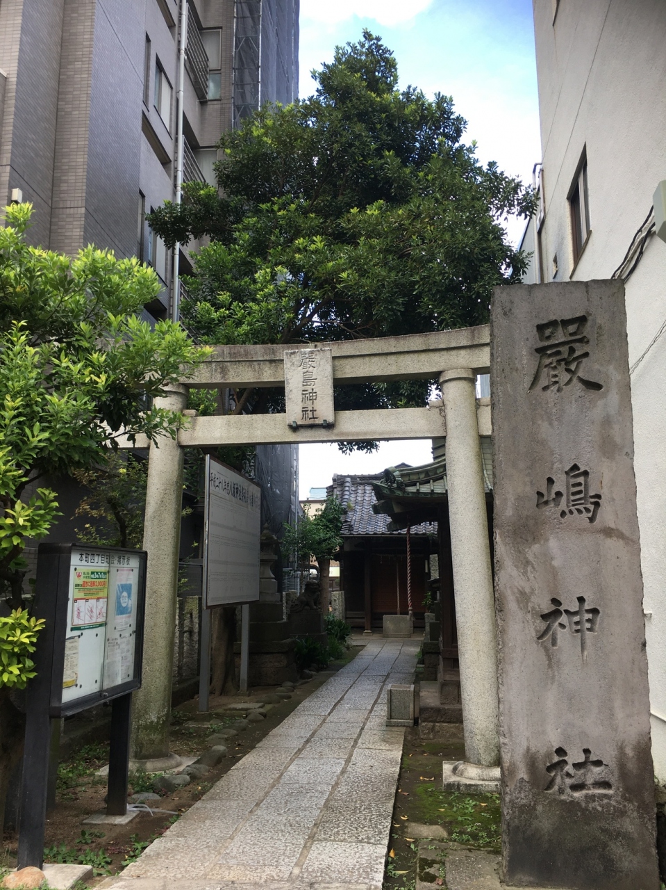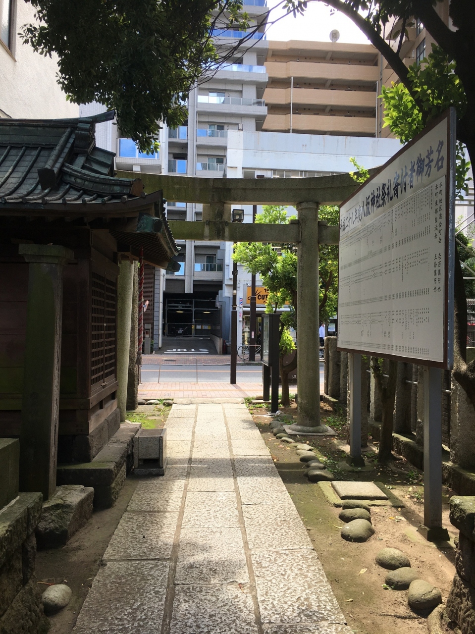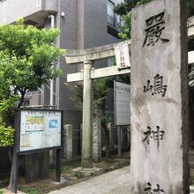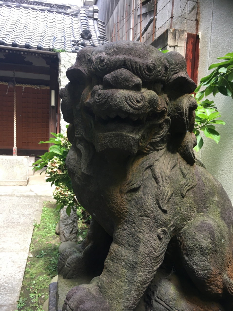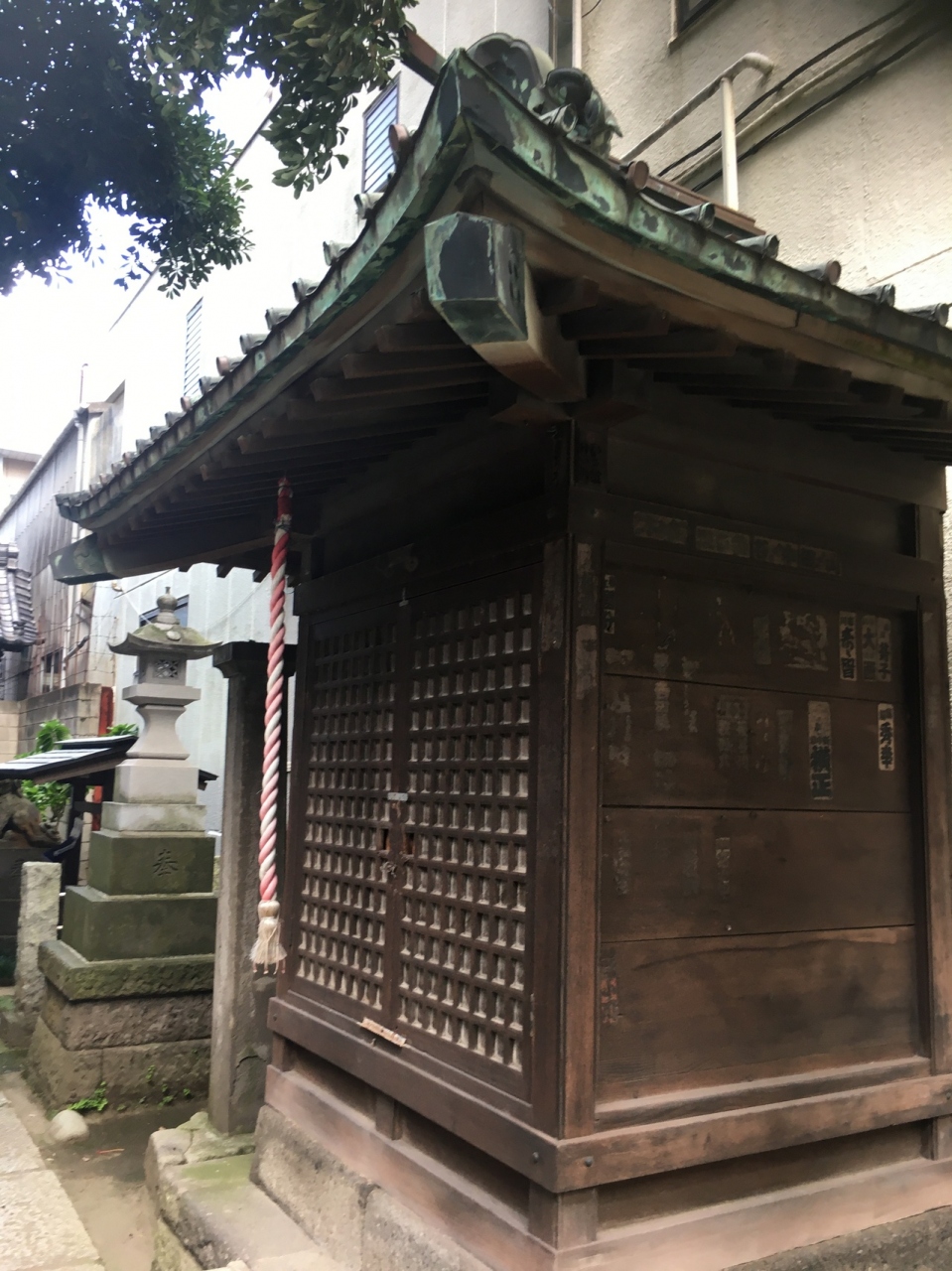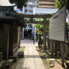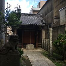 幹線道路沿いにあり、狭い出入口で、鳥居の後方の木が斜めに伸びていました。左右には建物が建っているため少し圧迫感がある短い参道で左右には獅子の像がありほこらのような社殿でした。石の賽銭箱があり鈴を鳴らしてお参りです。
