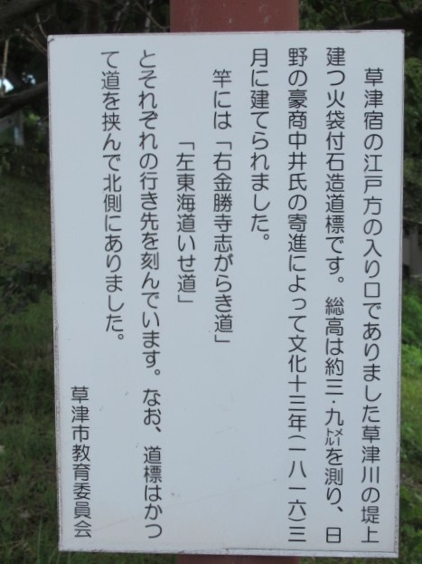 ここ草津宿にも数ヶ所建っていますが、この「横町道標」は東海道の江戸方向からの「草津宿」への入口の標識です。「左 東海道いせ道 右 金勝寺志がらき道」とあります。
