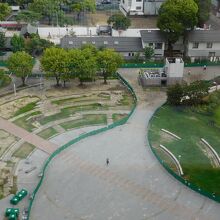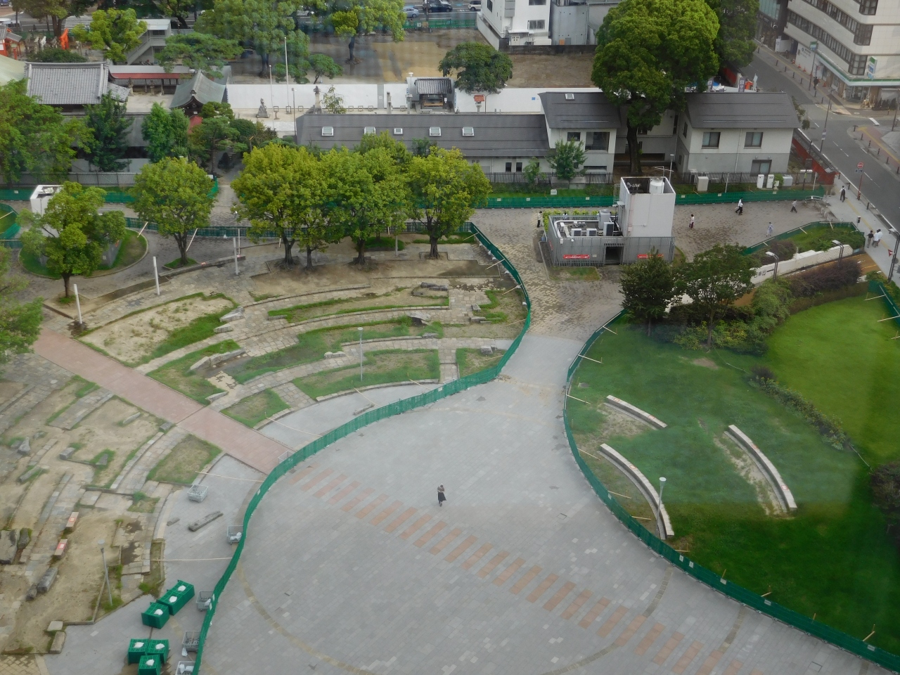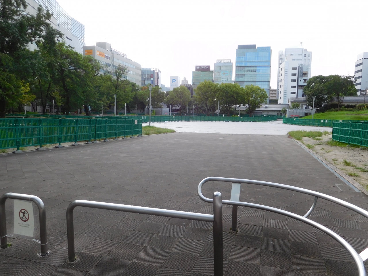 西鉄福岡(天神)駅と、ソラリアプラザの前にある、きれいに整備された開放的な空間の公園です。駅利用者が行き帰りに公園に立ち寄ったりする感じの場所ですが、現在は、新型コロナ対策の為に柵で囲まれていて、閑散とした雰囲気になっていました。