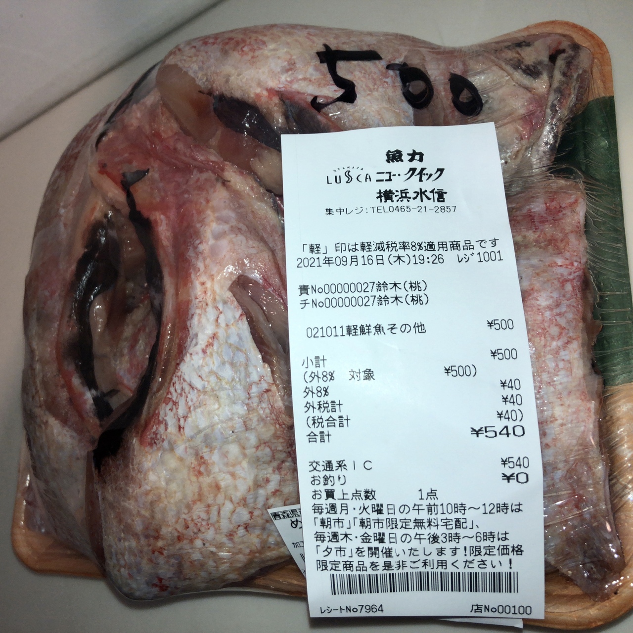 寿司や海鮮丼もあったのですが「めぬけ」のカマが視界に飛び込んで来たので衝動買い。ただし、レジにて表示価格の他に消費税もお支払い。レジのチェッカーさんも、この手書きは税抜表示です、と。