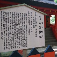 春日大社の摂社で聖流水谷川に沿ってお祀りされており、平安時代から幕末までの神仏習合時代は祇園精舎の守護神で医薬の神として尊崇され、「牛頭天王」とされていました。例祭は4月5日で、通称「水谷神社鎮花祭」として親しまれています。古くより病気平癒や子授けを祈る人が多いお社です。