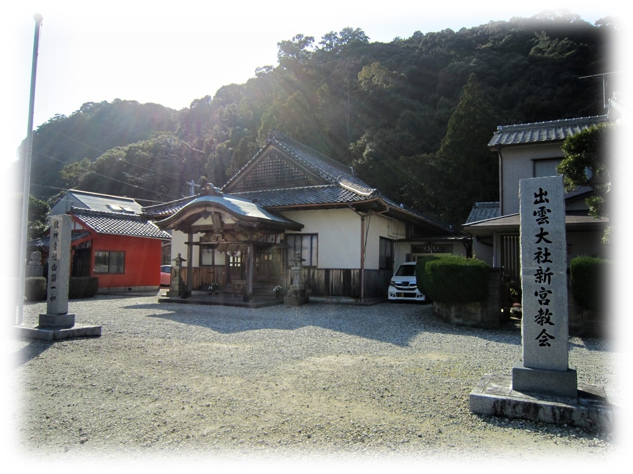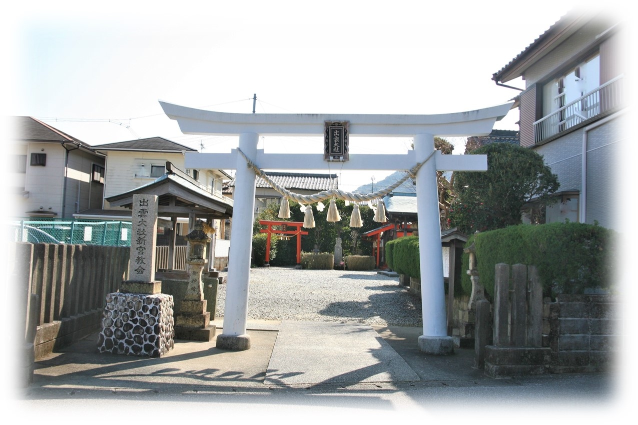社頭は神橋の手前25㍍程の参道沿いに写真の出雲大社(いづもおおやしろ)新宮教会が鎮座します。