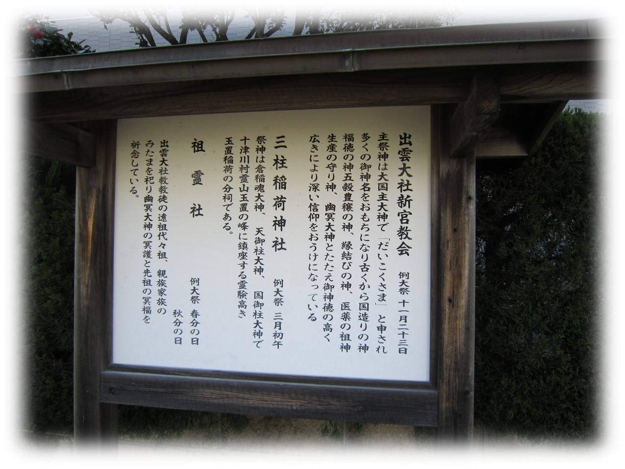 千家尊福は「出雲大社敬神講」を立ち上げ布教活動を行っていたが、明治15年、明治政府は神官の布教活動を禁じたため、千家尊福は宮司の職を降り「神道大社派」を結成し初代管長として布教活動に専念する事となる、その後名称を「神道大社教」へ改称し、昭和21年「出雲大社教」に改称、昭和26年に出雲大社を宗祠とする姿で「出雲大社教」と呼び現在に至っているようです、こうした教会施設を「おしえのにわ」と呼ぶのだそうだ。主祭神は大国主大神(だいこくさま)。