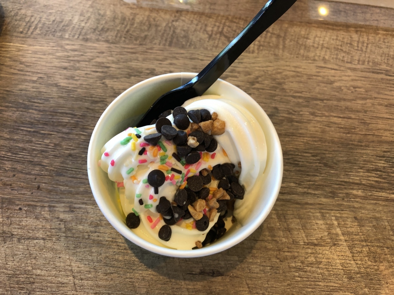 バニラ、ミルクチョコレート、パンプキン、ヨーグルトがありました。トッピングはマンゴー、カラースプレー、ラムネ、アーモンド、アールグレイ、チョコチップ、レモン、シュガー、ドライフルーツ、プレミアム•アマンド、イチゴ、ブルーベリー、チョコレートソース。
