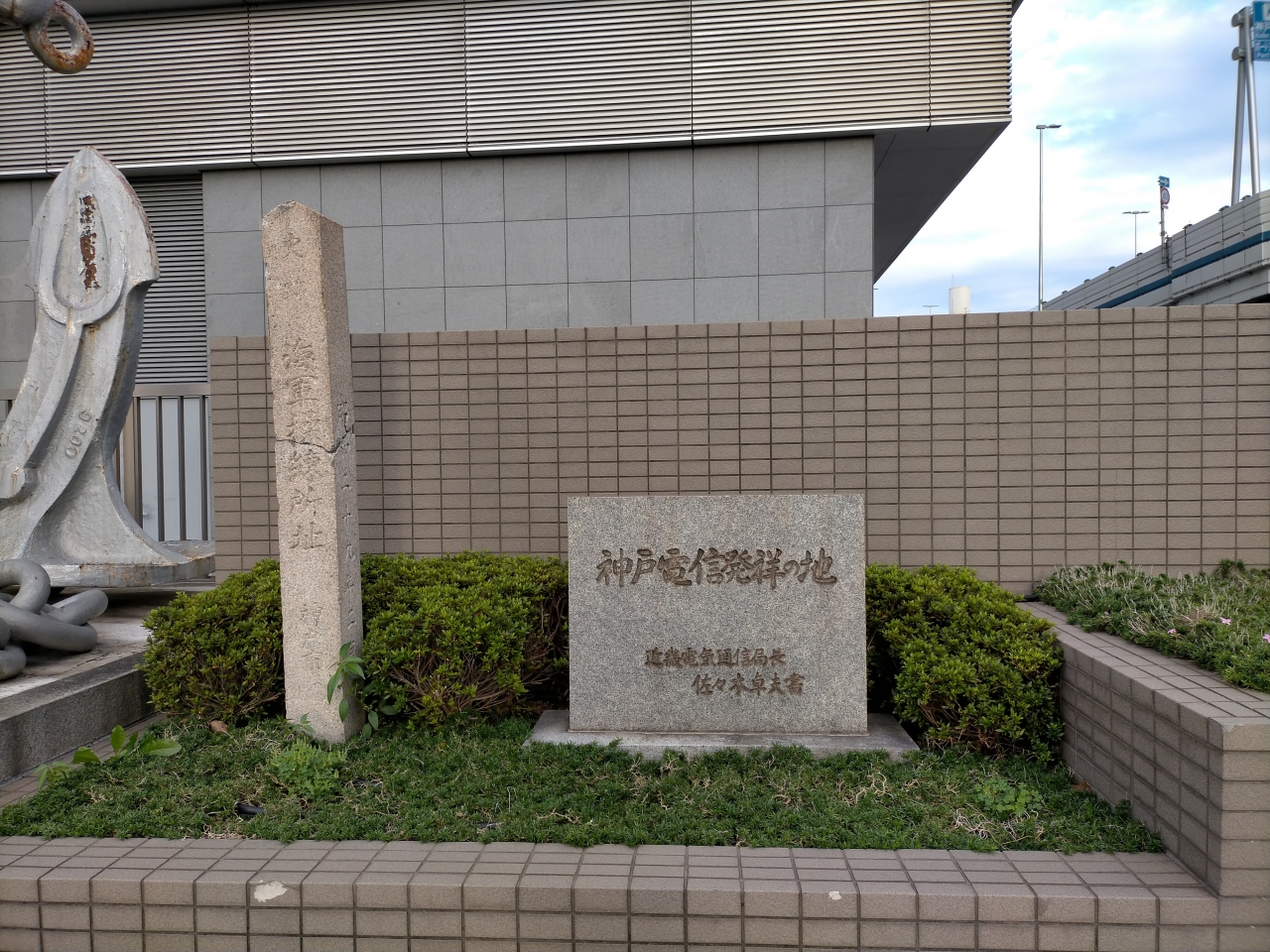 神戸電信発祥の地碑は、JR三ノ宮駅から徒歩15分くらい、京町筋、京橋交差点の直ぐ南側NTTドコモの敷地内に、史跡・海軍操練所跡の碑と並んであります。日本で初めて電信が商業的に使用されるようになったのは、1869年(東京~横浜間)が開通、その翌年大阪から神戸(神戸伝信機局)の間40kmに開通し、電報の取り扱いを開始したとのことです。
