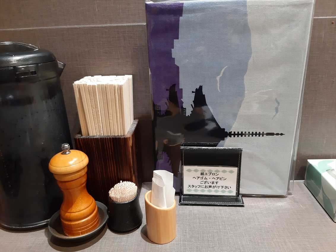 スタッフの物腰は柔らかく、テーブルに「紙エプロン、ヘアゴム、ヘアピンあります」と出ていて、お客への気配りが感じられました。