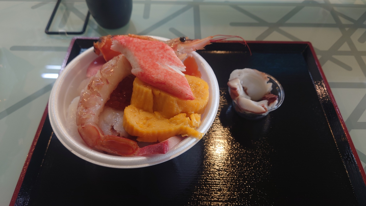 青森市に旅行したときに青森魚菜センター本店に行きました。のっけ丼という自分の好きな具材を乗せて完成される海鮮丼を作ることができ、今回は1500円と750円の食券を1枚づつ購入して、合計2250円となりました。乗せた具材はホタテ、赤エビ、はまち、タイ、イクラ、たこ、そい、カニカマ、玉子焼、中トロ、トロサーモン、炙りサーモンと12種類の具材を乗せ、具だくさんの海鮮丼となりました。ただ、新型コロナウィルス感染拡大防止のため、黙食となっています。