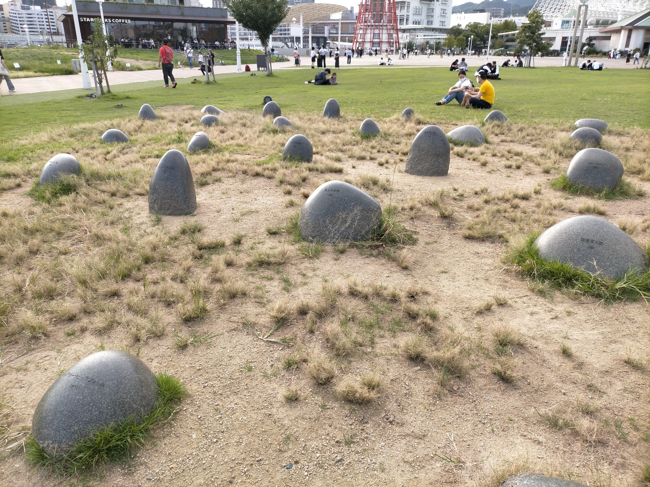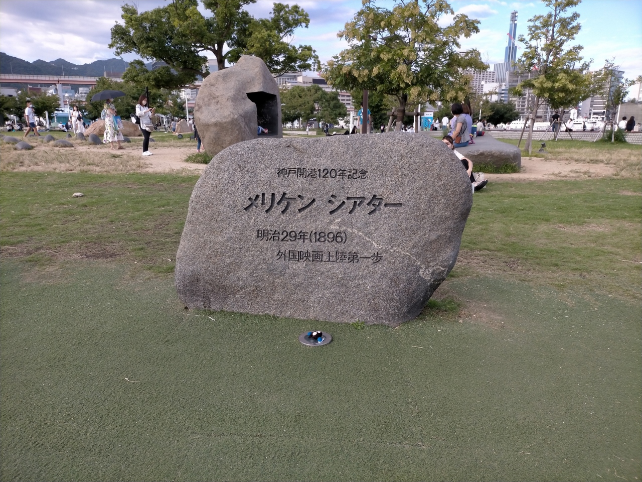 メリケンシアターの碑は、JR元町駅から徒歩15分くらいのところにあるメリケンパークにあります。この碑は、明治29年(1896年)に日本初の外国映画が花隈の神港倶楽部で上映されたこと、及びチャップリンが神戸を訪れた時にこの場所(メリケン波止場)に上陸したことから1987年に、神戸開港120年を記念してつくられたとのことです。42個の丸い御影石が並んでおり、国内外の有名映画スターの名前が刻まれています。
